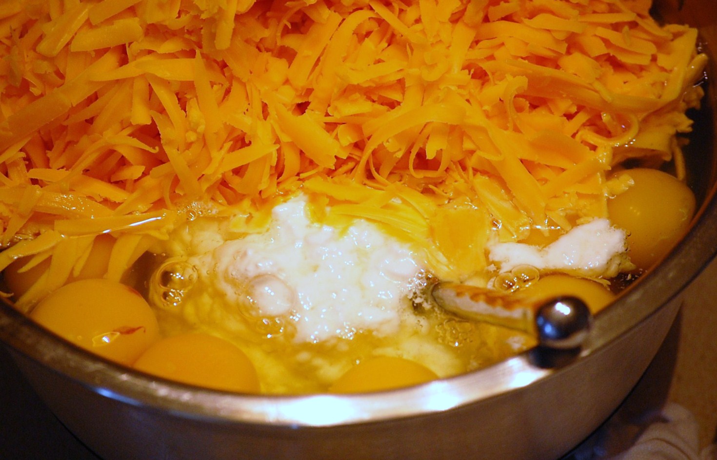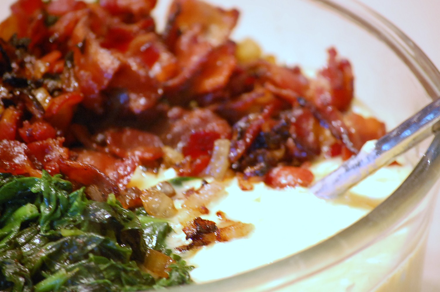 6. Add spinach, bacon, and onion to cheese mixture and fold together.