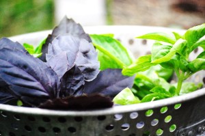 salad, the tomatoes starring, along with handfuls of purple and green basil also grown out back. This salad has no delicate, high-brow personality; it explodes in flavor and crunch and is unabashed in the unctuousness of the creamy dressing. Some may tremble at the use of bacon drippings and mayo in the dressing but key here, nutrition wise, is not the reduction of fat. More important is your brand of bacon, using the purest, nitrate-free meat available as well as a homemade or at least organic mayo.