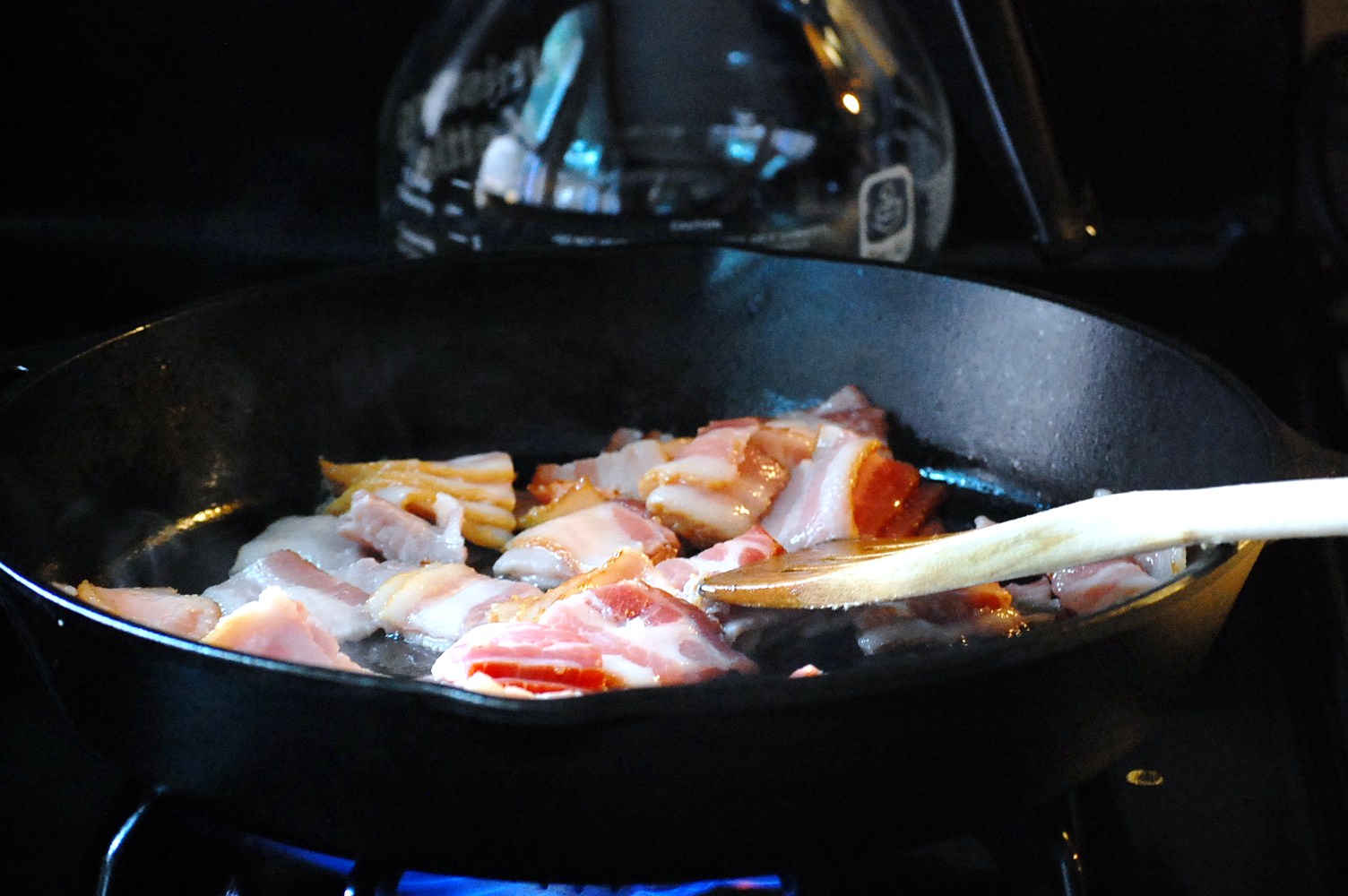 1. Chop bacon into 1.5 inch (or so) pieces and fry until crispy. Drain bacon and reserve drippings.