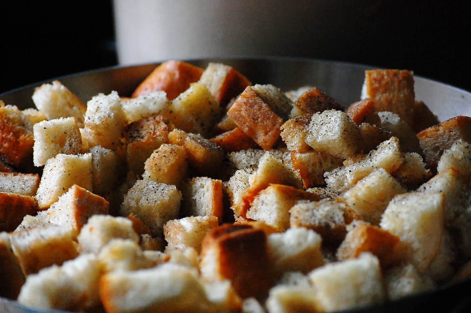 2. Cube bread and toss into heated skillet with butter. Season well with salt and black pepper.