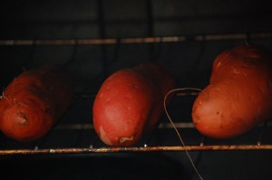 1. Preheat oven to 400 degrees. Wash and pierce sweet potatoes and place them directly on the oven rack. Bake for 45-60 minutes until soft all through.