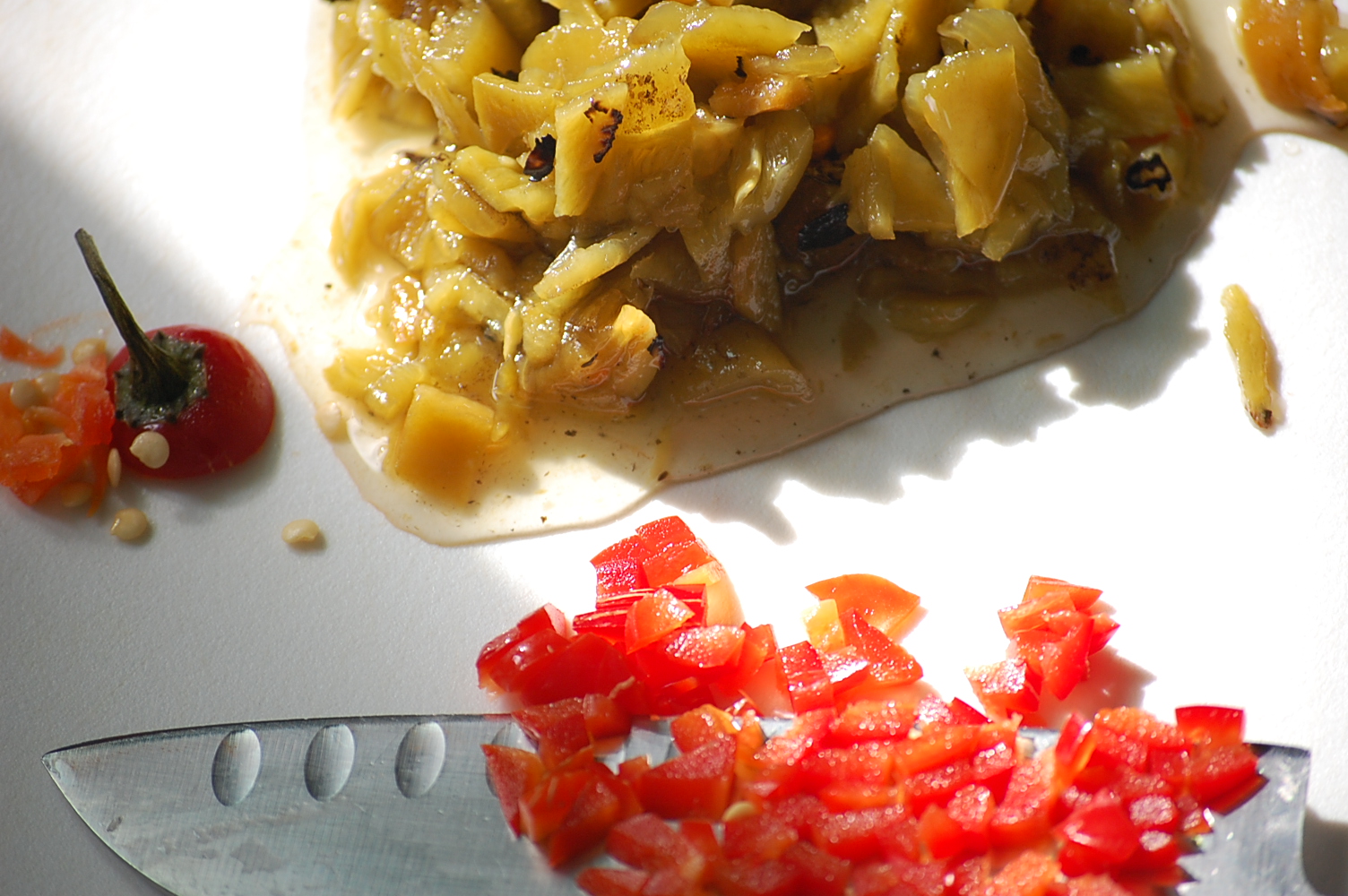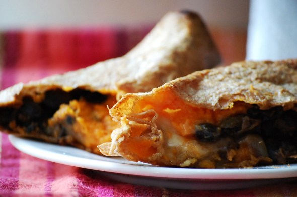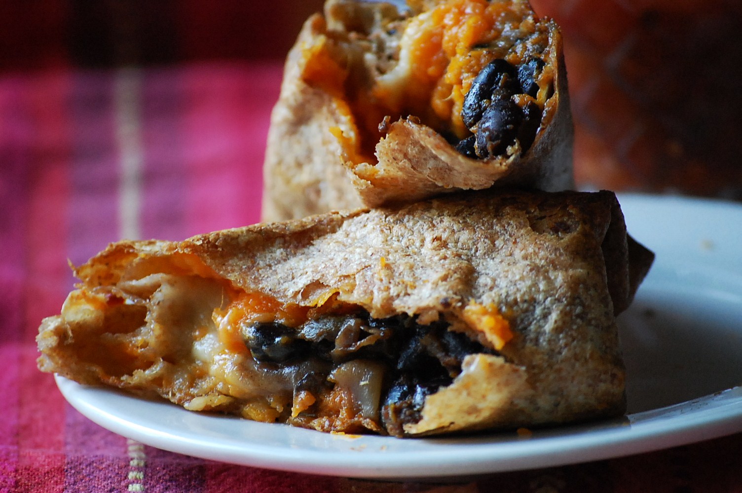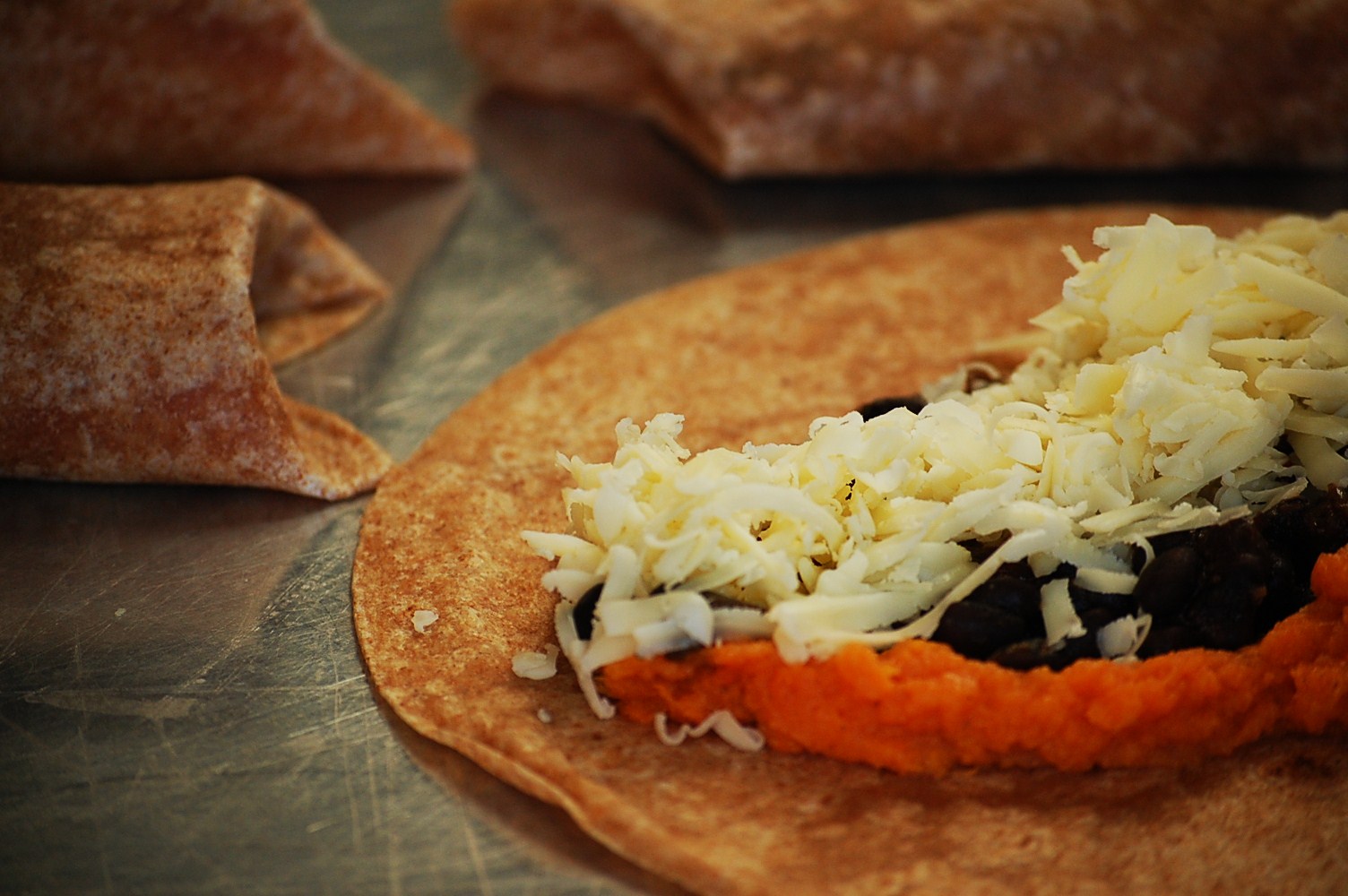 One day my fridge and pantry supplies were rather sparse…though I had some cooked black beans and sweet potatos sitting in my onion basket and I thought they would pair well together. I did a quick google search and found a base recipe for what my mind’s mouth had been imagining. I reinvented the recipe to my taste and since then I’ve had cravings for the warm, earthy, spicy flavor combination. One of the last times I made this recipe I was in charge of a camp kitchen. The 35 hiking-hungry campers, including lots of kids seemed very satisfied with these burritoes even though we had forgotten to bring the cumin and chili powder. To amp up the beans we threw in green onions and various hot peppers minus the seeds. This is definitely one of those flexible recipes you can add salsa, peppers, cilantro, a squirt of lime… For me, the cheese is what keeps me coming back, it’s the bit of decadence oozing out of the colorful interior and the bit of chew to the burrito. My husband would still choose a meat and cheese burrito but he eats these eagerly. This makes 12, but you can easily freeze half or simply halve the recipe.