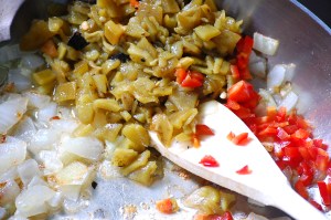 3. Add cumin, mustard, green chilis, jalepeno and chili powder. Cook on med-high for another minute or so.
