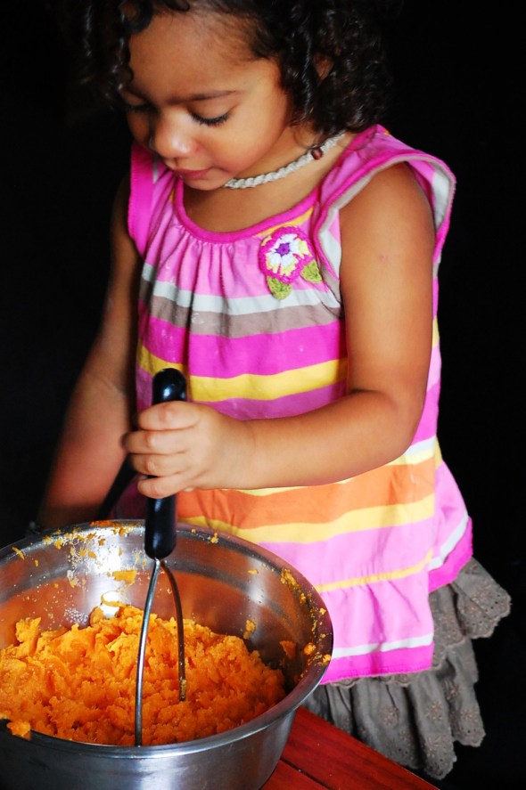 5. Peel sweet potatoes. Add salt and pepper to taste, and butter. (Just a note, just because a two-year old can help with the mashing doesn’t mean she should be allowed anywhere near the salt!) Mash well.