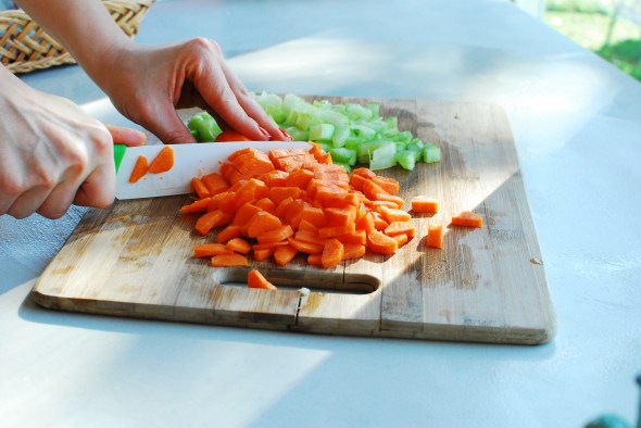 4. Cover with foil and bake 30 minutes. Meanwhile, chop carrots and celery thinly.