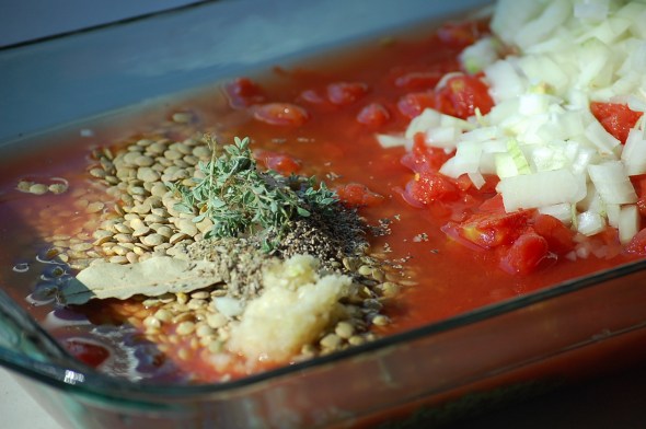 3. Mix together lentils, water, tomatoes, salt, pepper, marjoram, sage, and thyme, garlic, and onions in a 9×13 baking dish.
