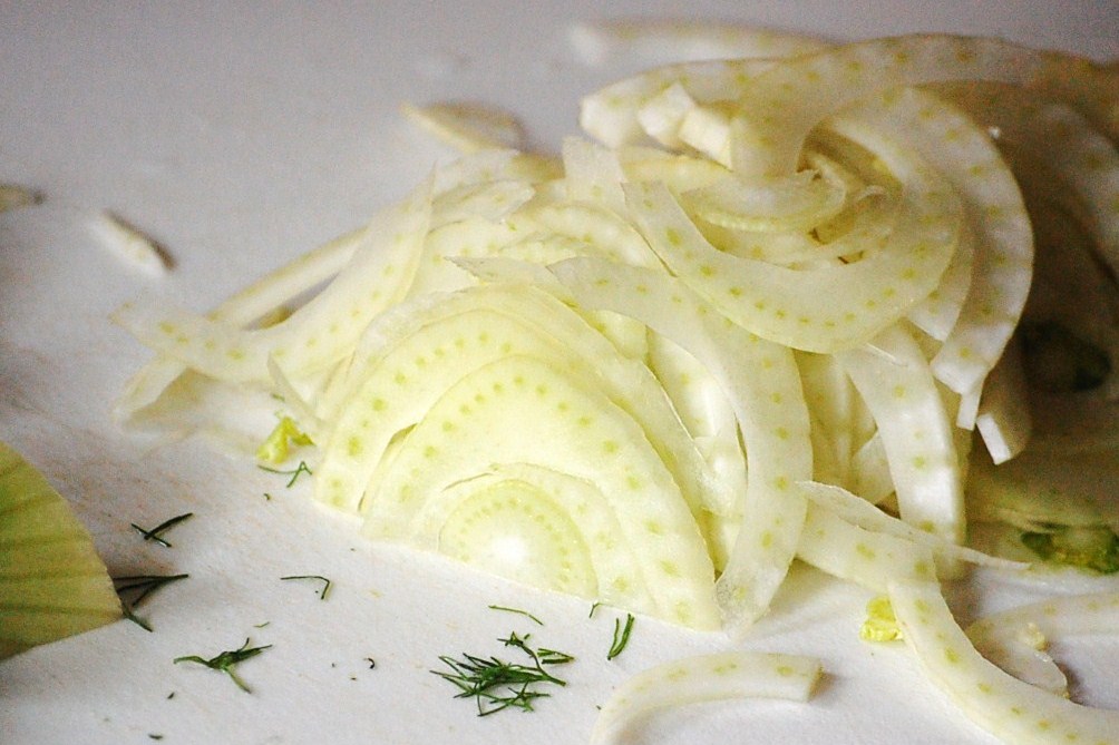 3. Slice off the frondy tops and the base of the fennel, cut into half and then into very thin slices.