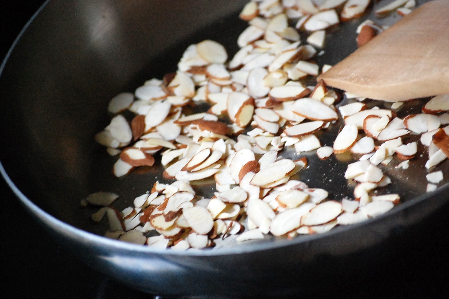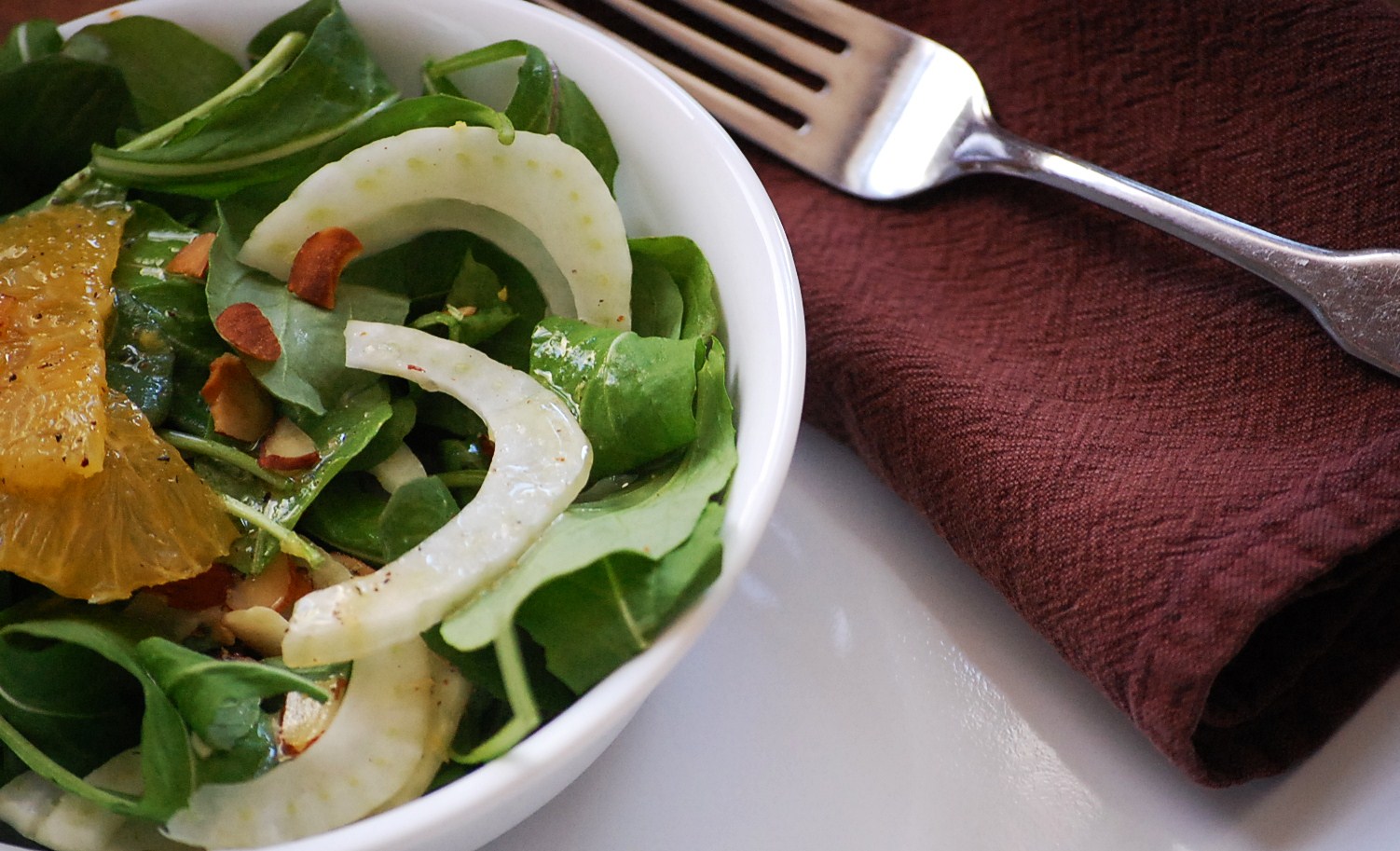 Up until recently I have been mystified by fennel. I hadn’t found anything (in my few attempts with fennel,)that I really liked it’s anise-y crunch in. And then, in one of the very last CSA buckets of the season, came a crisp and frondy bulb of the most gorgeous fennel. It deserved respect. I found a common theme in online recipes pairing fennel and orange. So I dared to actually not only slice fennel into my salad but oranges too! Supposedly I was never going to mix fruit with salad. My nana used to cut up bits of fruit, bananas and oranges into salads along with vegetables like celery and green pepper. To me this was such a travesty, like when my mom would ruin a perfectly delightful jello with nuts, or worse, carrot shreds. Now I have been won over to some of those exclusively adult taste combinations like Waldorf salad and even marvel at a simple, sophisticated salad like this. The arugula can be interchanged with tender spinach leaves but the peppery bite it offers really adds something special. The orange slices temper the zesty greens with a sweet juiciness and the fennel and toasted almonds add alternately fresh and nutty crunch.