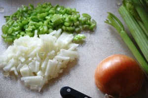 2. Meanwhile, dice onion and celery. Add to the simmering beans and continue to cook until just tender, about 30 minutes.
