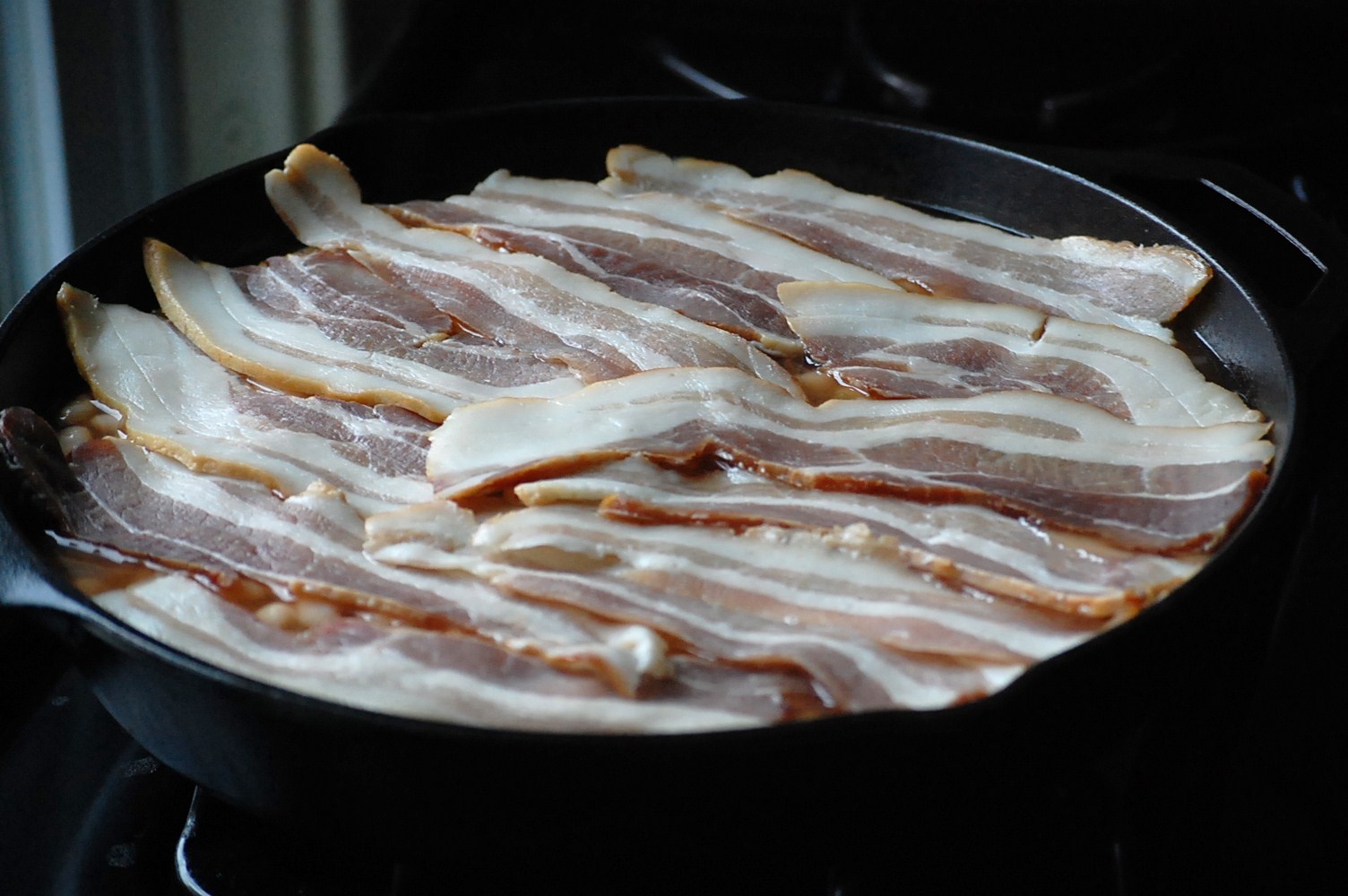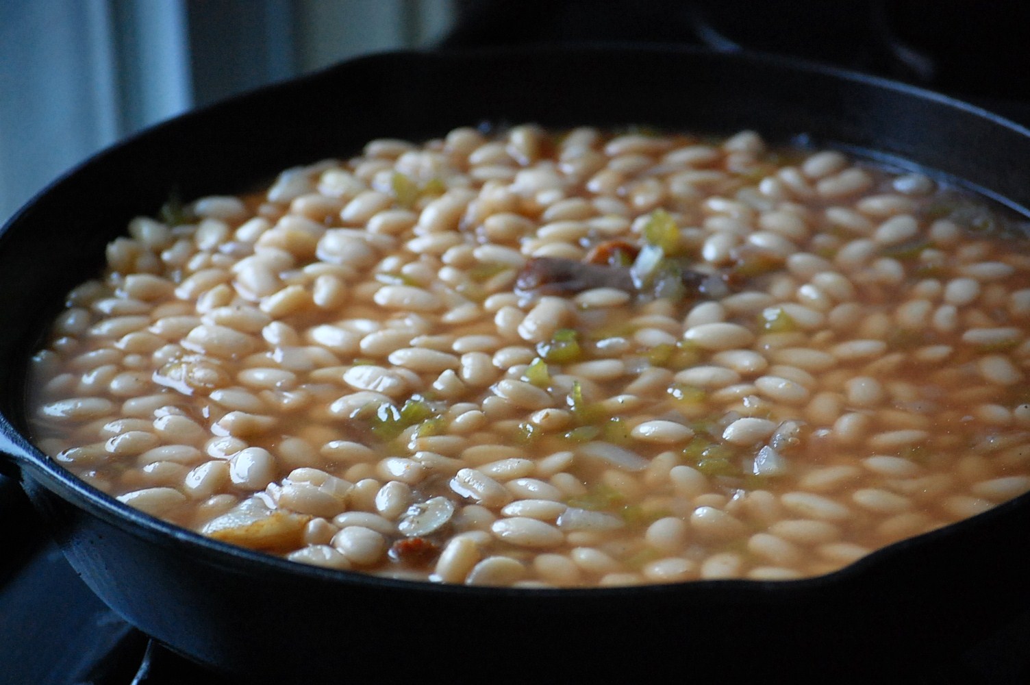 1. Drain off soaking water. Simmer beans in fresh water to cover. Add 2-3 pieces bacon or salt pork and pepper. (This bacon is the best I’ve ever tasted, having been cured by our neighbors and raised locally!)