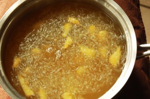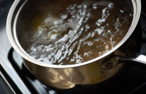 2.  Pour water into a saucepan and add ginger slices. Bring to a boil and simmer for 15-20 minutes. Allow to cool somewhat.