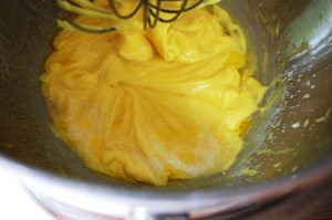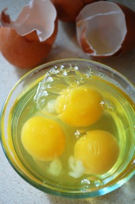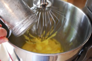 1. Separate yolks from the whites by tapping eggs on the counter, breaking in half, and dumping the whole egg into a bowl. Gently scoop out the yolks and drop into a mixing bowl.