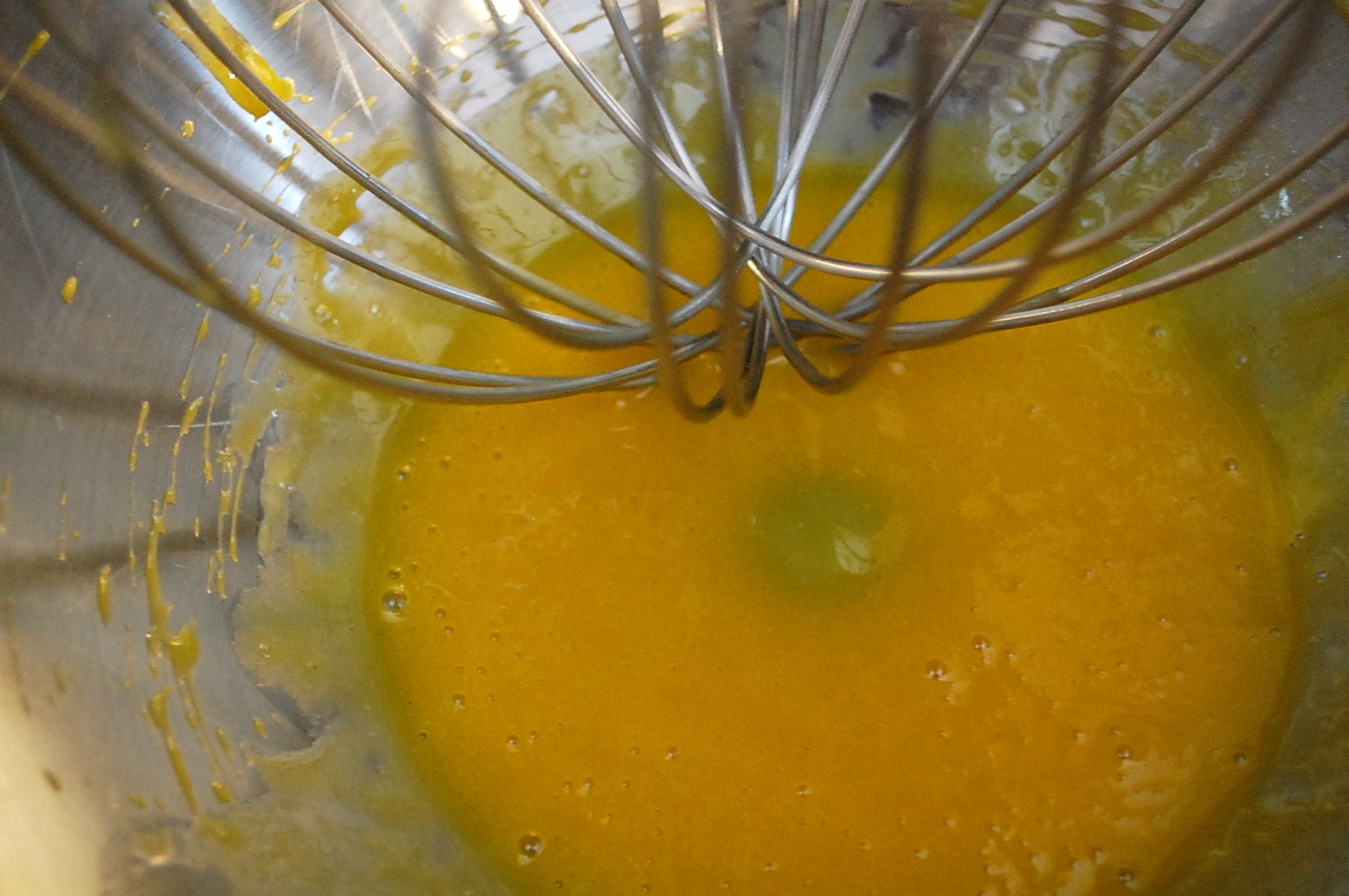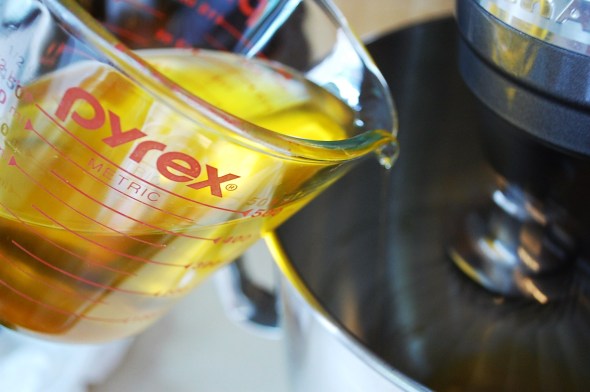 3. With the mixer/food processor (Using a Vita-mix hasn’t worked for me, I think it tends to be too powerful, even on the lowest setting) on medium-low, add oil just in drops at first. The first 30 seconds are crucial. Be very patient. Pour the oil in slowly. Gradually increase to a tiny stream and keep pouring until the oil is gone.