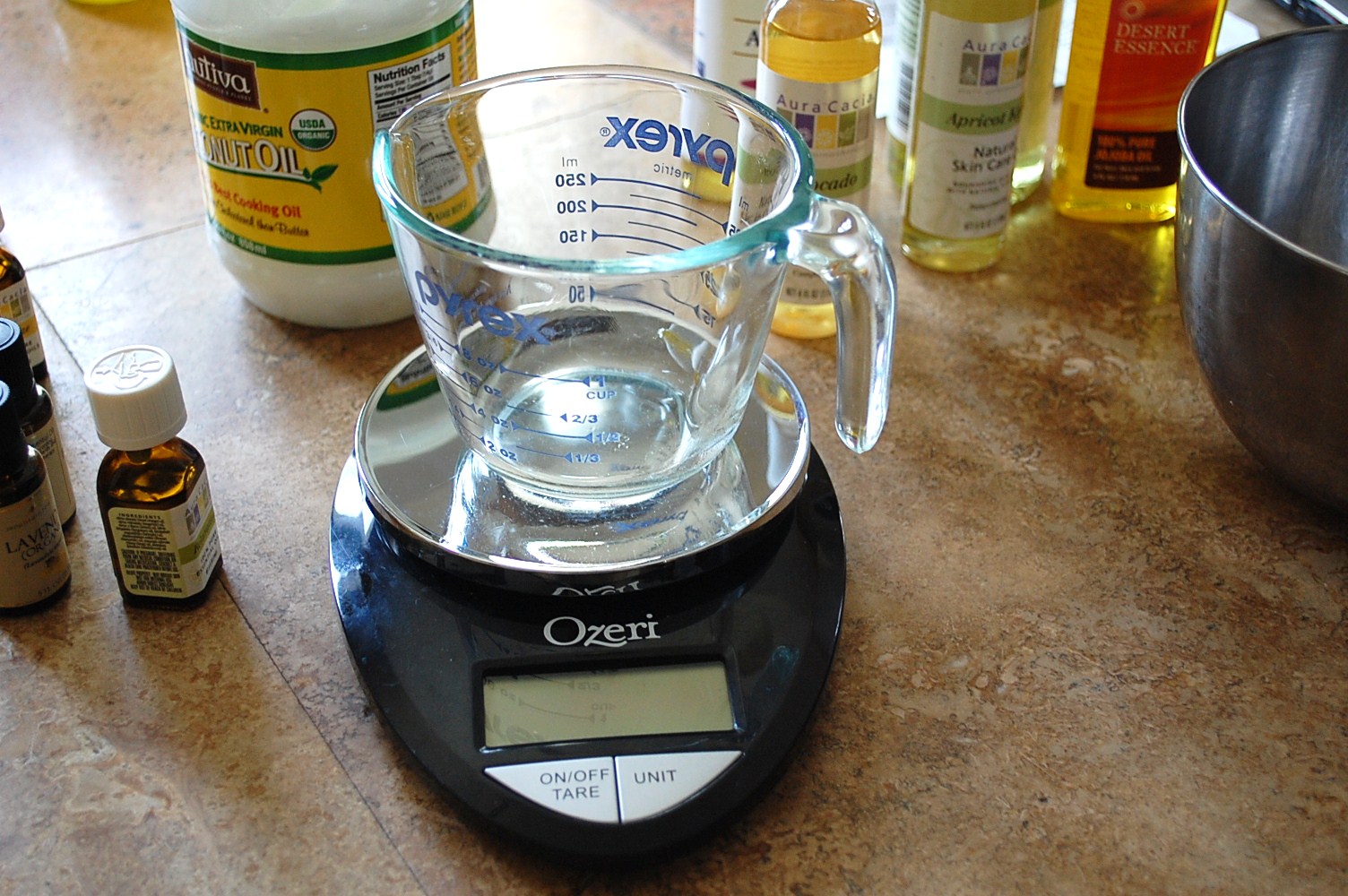 2. Set a measuring cup onto scale and tare back to zero. Pour 60% of whatever total amount you wish to make. (In my case it was 5.8 oz.) I cheated so badly on the math, I actually texted my engineer husband to work out the problem. I didn’t even bother to look for a calculator.