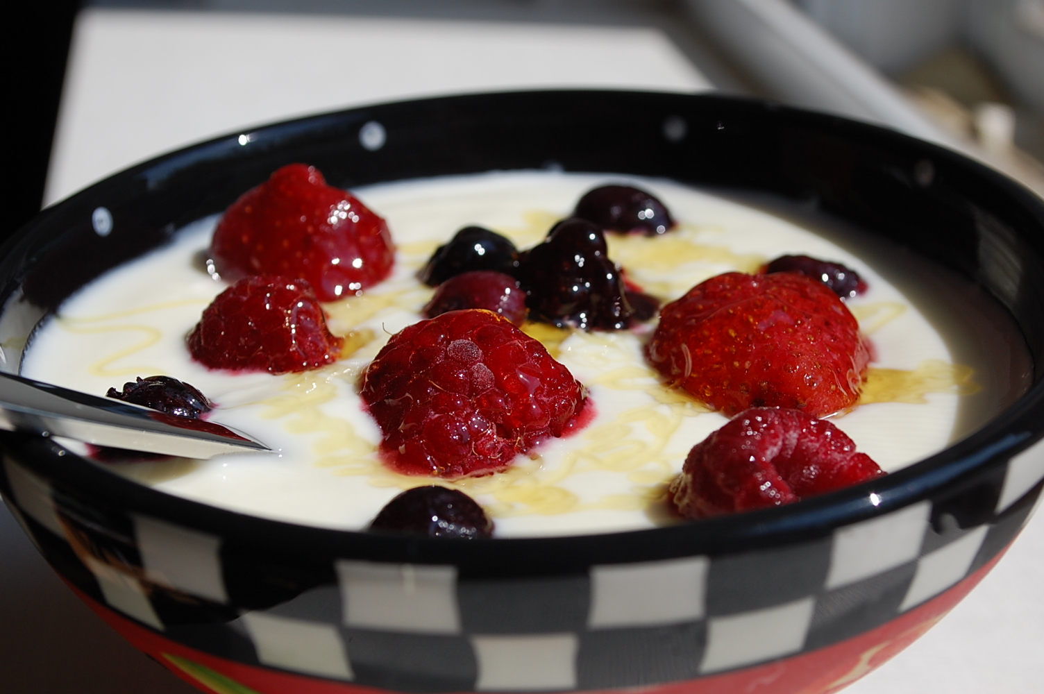 Yogurt was high on my list of cooking challenges to conquer. I don’t even want to consider the money I’ve spent on quart after quart of whole milk yogurt and even greater amounts spent on those 6 ounce tubs of the incredibly rich, sweetened Liberte brand! I am a yogurt addict when it comes down to it.  Over a year ago I began to make my own lovely batches starting with pasteurized organic supermarket milk. When we began to use raw milk the yogurt improved even more. I’ve had a half-dozen failure batches but not only was that part of the shallow learning curve, but you can always find a use for it in baking and smoothies, frozen in cubes for a “frozen yogurt”… I have strained dozens of quarts of yogurt into yogurt cheese, added lemon and salt for a  Middle Eastern Labene and made my own Greek yogurt by whisking half of super-long strained yogurt with the looser stuff. Yogurt making is now a relatively effortless part of my schedule. I simply use a quart of Stonyfield plain whole milk yogurt as a starter culture; it makes a smooth and mild yogurt. It usually last me from 4-5 weeks before I need to buy a new one. You can buy small boxes of yogurt starter in the supermarket, however, they usually only make a small amount and I find them rather expensive. Another option is to order a perpetuating culture (one you can re-use from batch to batch) from Cultures for Health, they carry a fascinating variety of yogurt strains.