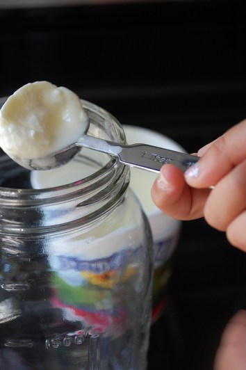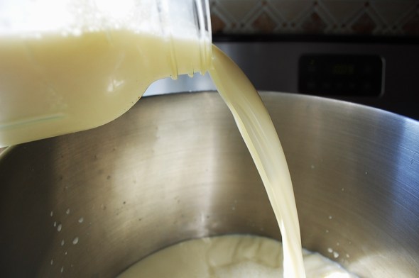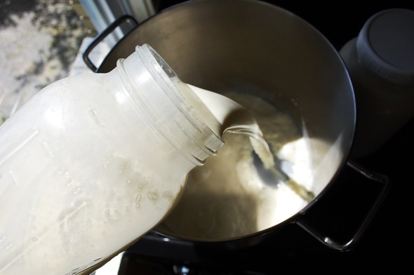 3. Put your starter into glass jars (I use 1/2 gallon jars) and pour a small amount of the cooled milk through a sieve (this removes any “skin” that may have formed during the heating step) into the jars. Whisk gently to combine.