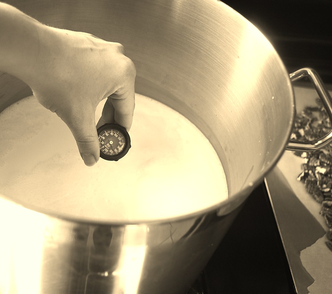 1. Heat the milk (I’m making 4 quarts in this recipe) to 180º. Watch for overflowing pans. If your pan does overflow it likely means that it went over 180º, which is actually ok, I have overheated my milk so many time and yet it still manages to turn out. Basically you end up pasteurizing the milk with this step. I don’t like to do this to my milk but I figure you still are getting the beneficial bacteria from the incubating process. The reason I prefer the higher temperature is because you create a much firmer yogurt. If you prefer, you can simply heat the milk to 110º instead and preserve the live enzymes. Of course if you are using already pasteurized milk you wouldn’t need to bother trying to be gentle with the heat.