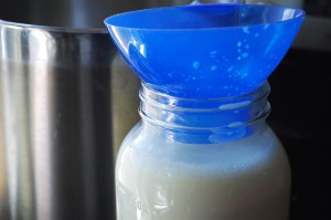 4. Pour the rest of the milk through the sieve into the jars. Stir gently. Cap tightly and incubate 6-12 hours at a temperature of around 110-115º. I find around 8 usually works best for me. The longer incubation results in a more tart, usually firmer yogurt. You may have to get creative for this step. I have wrapped my yogurt in towels and left it on the counter, left it in the oven with the light on, (this never worked well for me, you actually need a pilot) but I found filling my laundry tub with hot water works excellently, even though I may need to change the water once or twice. Other methods of incubation include putting the yogurt in a preheated thermos,  a heating pad and towels, using a crock pot on the warm setting,  an insulated cooler with hot water poured inside…