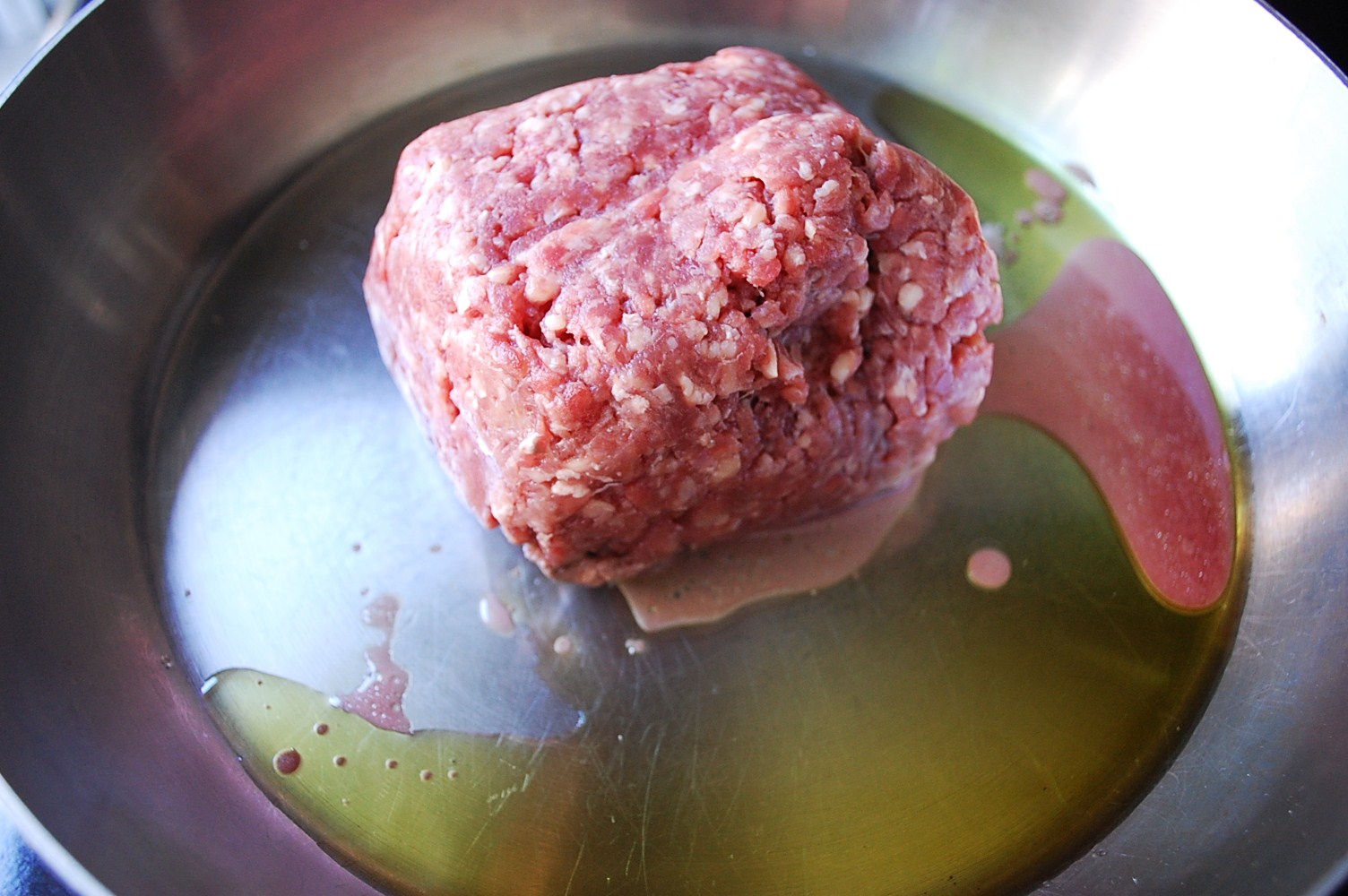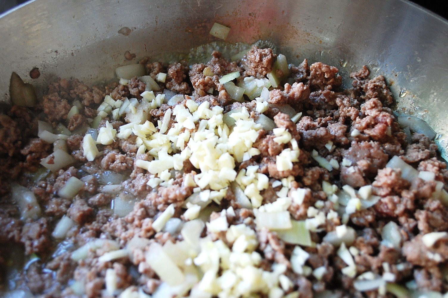 3. Chop onion. Brown ground beef in a frying pan, breaking it up as you go, and add onion. Saute until onion is soft and meat is fully cooked. Chop garlic and add to pan, cook an additional minute or so. Season with salt, pepper, and hot sauce. Pour meat mixture into pie crust pressing down slightly.