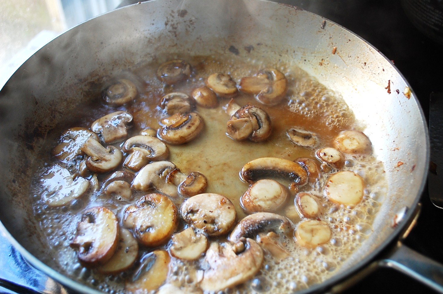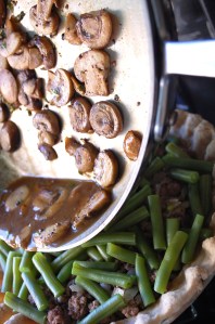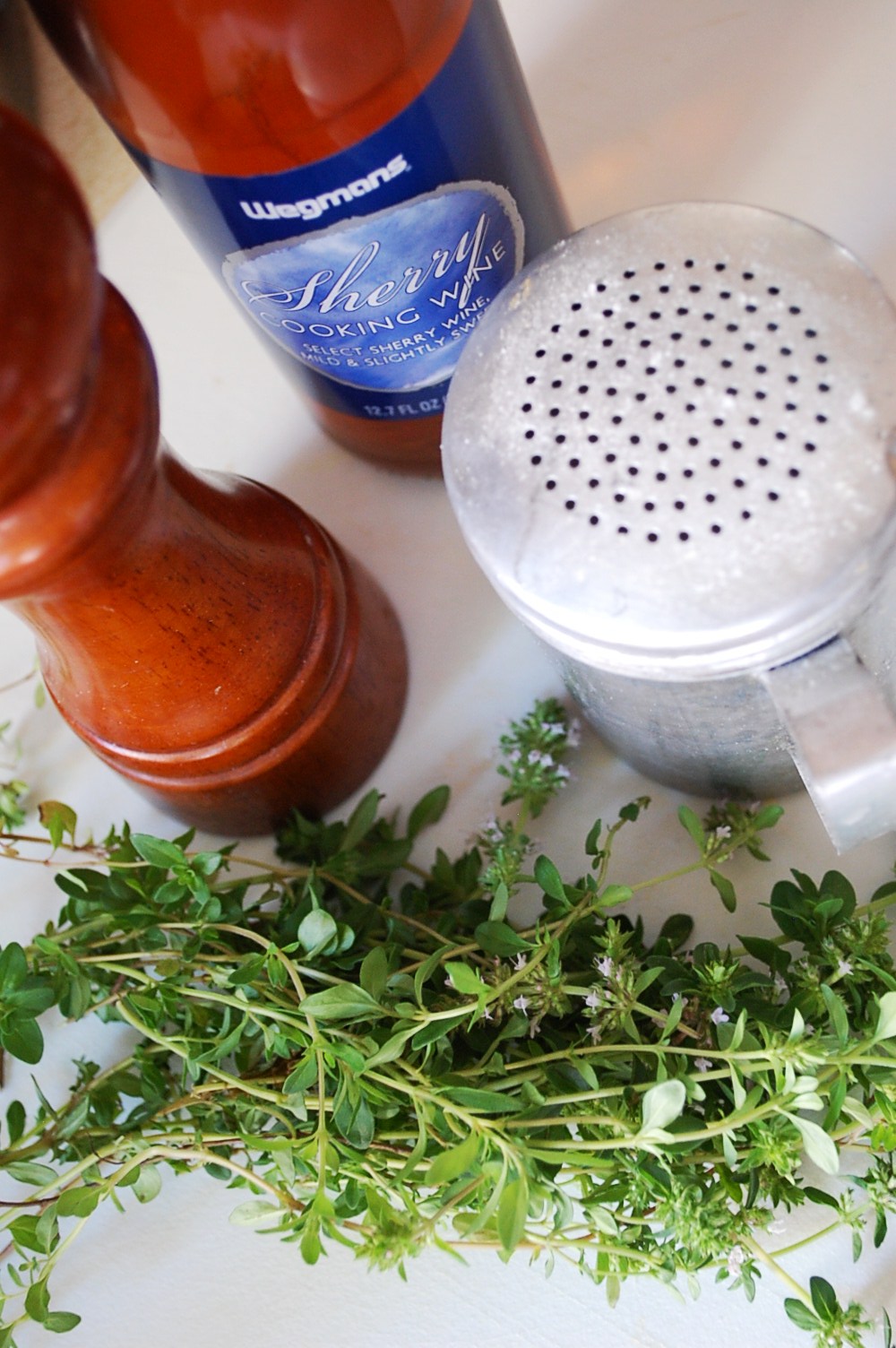 4. Saute mushrooms in 3 Tbsp. butter–in the same pan used for the meat–until golden brown over med-high heat, sprinkle with salt and pepper, add thyme, and sherry. Boil until sherry is reduced by a 1/3. Pour mushrooms evenly over green beans.