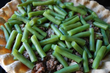 5. Trim and chop green beans into thirds. Cook briefly in boiling salted water until just tender, about 5 minutes. Taste for seasoning. Spread over meat mixture.