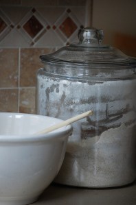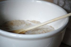 I am on a quest to bake the simplest but most nourishing bread I possibly can. The ultimate dream is to consistently bake bread (and bagels, English muffins, pizza dough etc.) using my own sourdough starter. I have yet to take on that challenge. In the mean time, this recipe bakes 3 loaves of beautiful 100% whole wheat bread (I’ve experiemented with other whole grains, barley, spelt, and rye flours, and this has been a wonderfully flexible recipe.) with springy, lightly sweet and nutty-tasting results every time. There are few things as satisfying as baking your own bread. Not only is kneading a therapeutic experience but you can actually get a work out after folding, turning, and pushing for 10-20 minutes! I don’t see any reason why you couldn’t use a Kitchen-aid type mixer, however, I’d reccomend at least beginning bread-making (unless you already have an excellent “feel” for the texture of elastic, well-kneaded bread) using your hands. You can then familiarize yourself with the development of the gluten as you work the bread. And the formation of gluten, through kneading, is really the main key to lovely-grained bread! One of the other important factors, especially in taste is the freshness of your flour. If you have the ability to grind grain yourself, this is by far the best. Next best is to buy bulk organic flour from a source you know to have a high turnover rate.