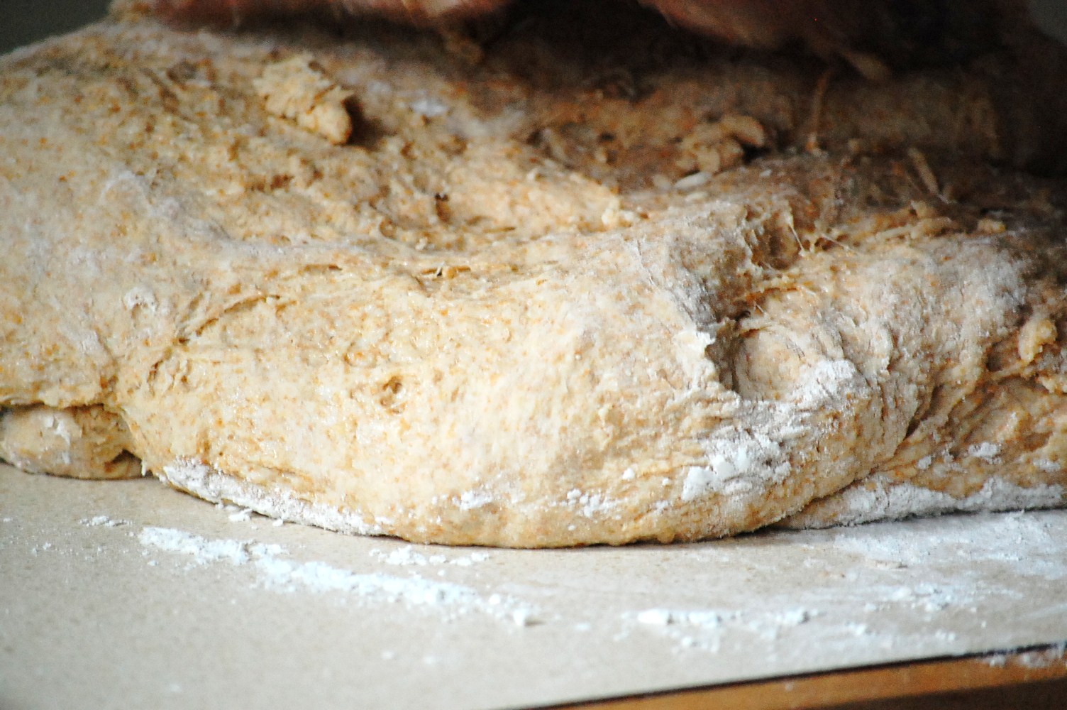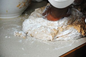 3. Dump dough onto a floured surface and knead for 10-20 minutes until smooth and elastic. (It will be super-sticky in the beginning and while you can use flour on the surface and to dust the dough, don’t add full cupfuls, it will ruin the texture of the bread. Use only enough to be able to knead.)