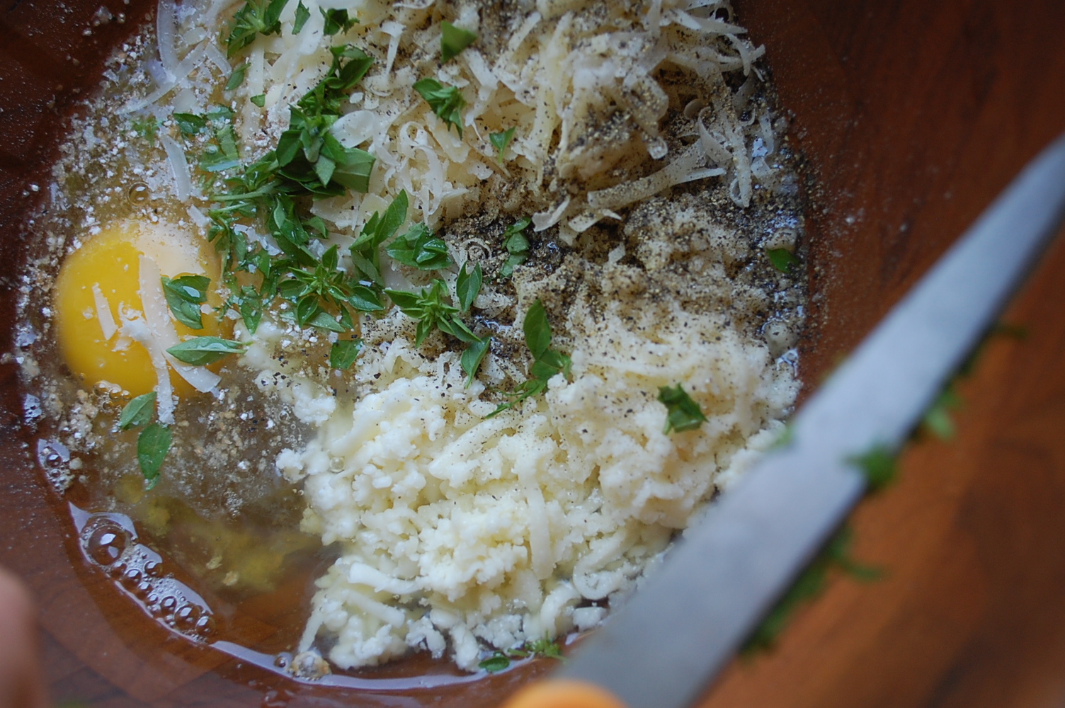 2. Mix flour, eggs, cheeses, olive oil, garlic, and basil. Finely chop or mince the basil and garlic. Season with salt and pepper.