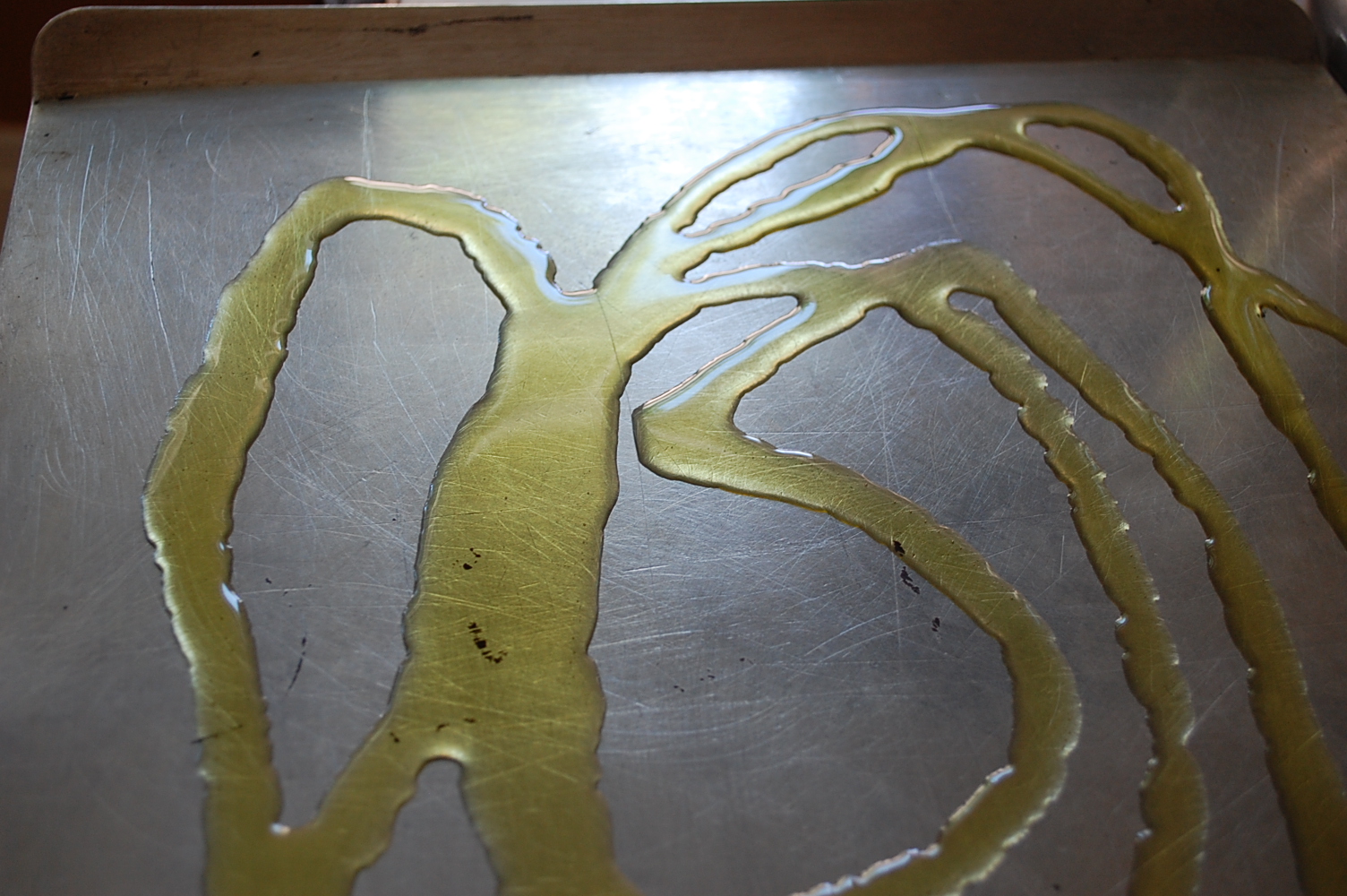 4. Oil a rimmed baking sheet liberally. Spread the crust onto the pan and bake for 25-30 minutes or until the crust is firm and dry to the touch.