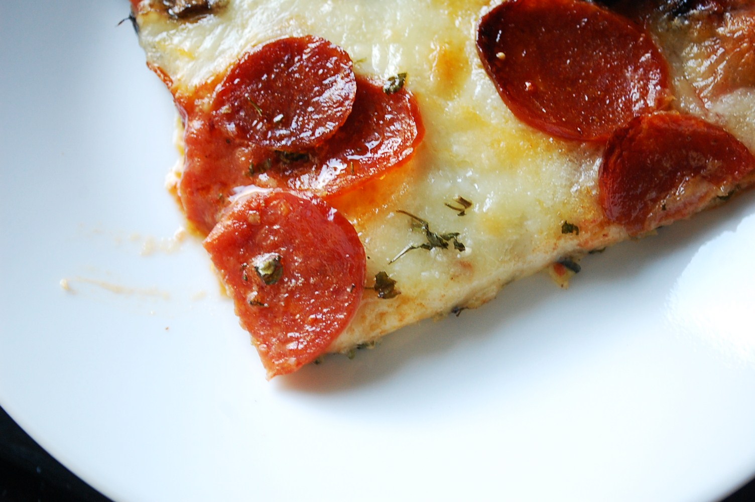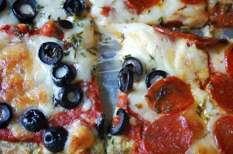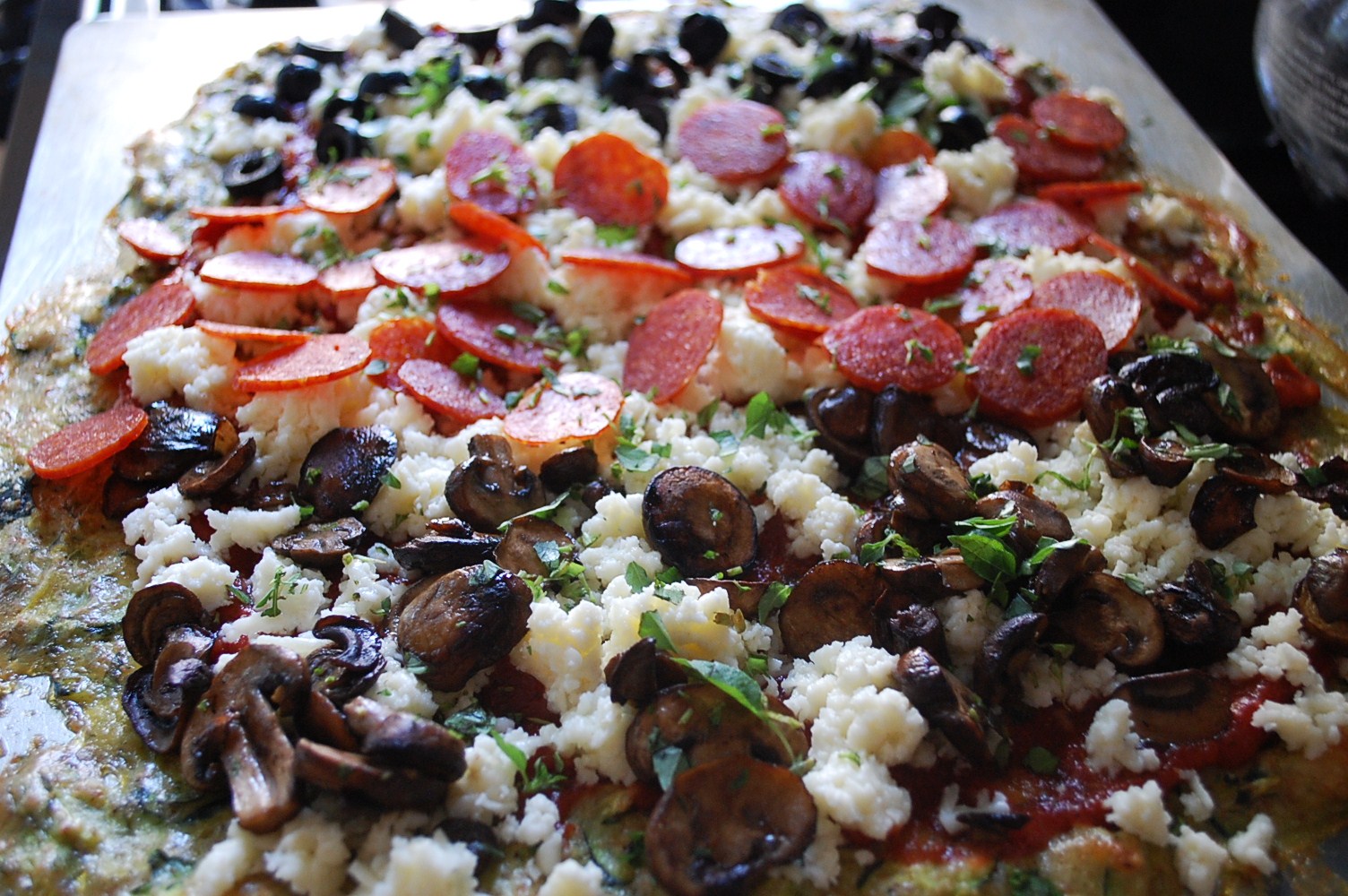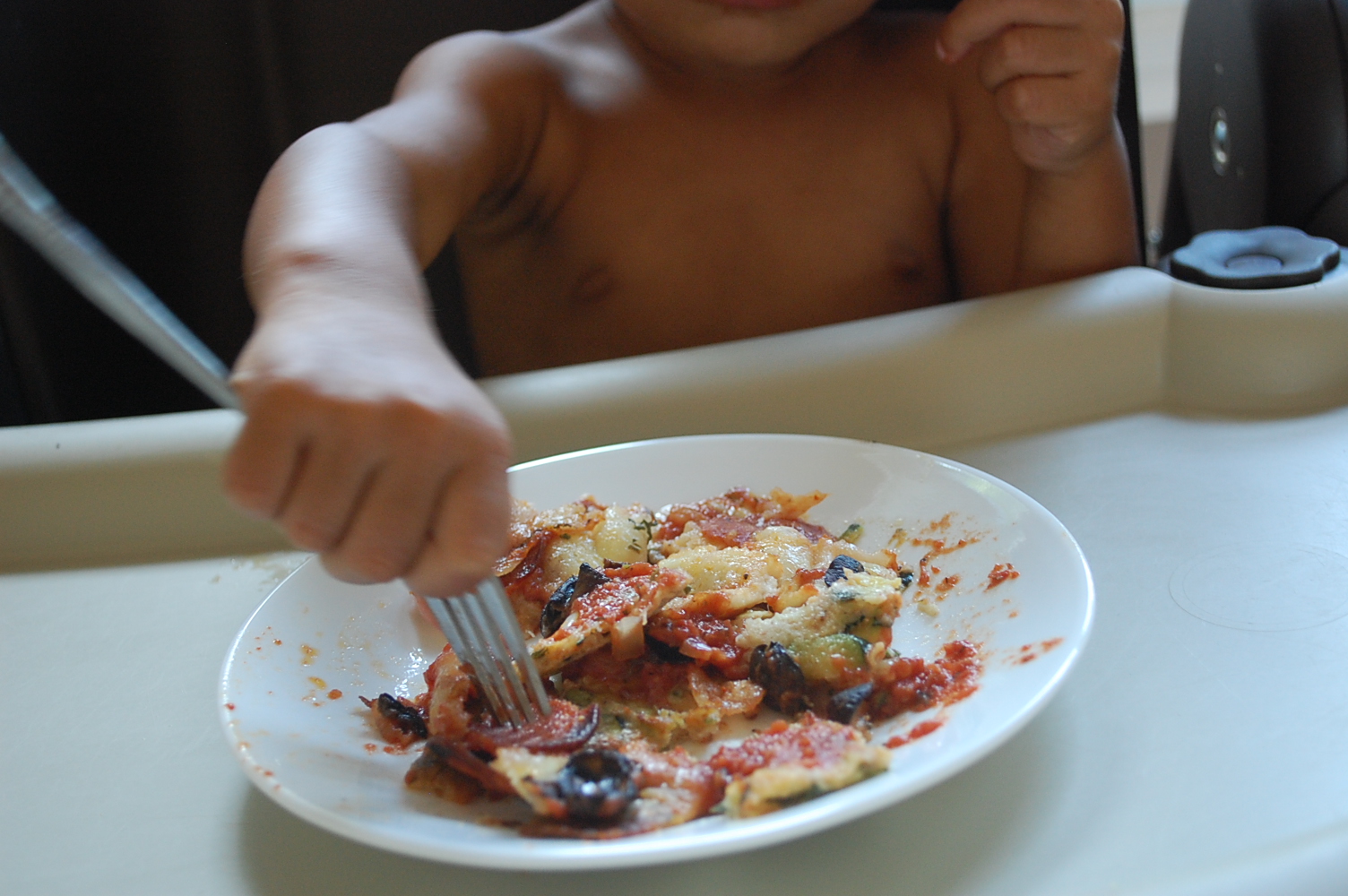 I feel like I have waited so long to enjoy zucchini. I’ve resisted buying out-of-season supermarket zucchini almost entirely, all year. Finally, it’s zucchini season and I’ve been inspired to find recipes that make the most of this prolific summer squash. I was extra motivated when my mom sent me home this weekend with 5 gorgeous baby zucchini; just the way I like them, incredibly tender and not bitter in the slightest. In this dish the flavors of summer come together so naturally. Basil and zucchini pair beautifully as a unique low-on-carbs pizza. The crust is flavorful, slightly chewy and sits so lightly in the stomach. Not to mention easy! This is one of those dinners that can be put together in less than 3o minutes and popped right into the oven. My babies devoured theirs although my daughter picked off her pepperoni pieces declaring them too spicy. My son picked his pepperoni off the top too but he was just eating the best part first! This could easily be the main dish in a summer meal especially when topped with bits of meat. The toppings are easily varied, cheeses, peppers, onions, sautéed mushrooms, spinach, bacon, tomatoes etc. This recipe has been adapted to my tastes from one of the first editions of a Moosewood cookbook. They were really on to some delicious food back then–when people were less afraid of adding fat for unmatchable flavor!