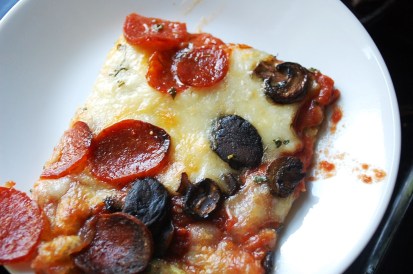 5. Add all your favorite toppings; I used mozzarella, pepperoni, sautéed (lightly salted) baby Portobello mushrooms, and black olives. I also made my own pizza sauce a few hours in advance to meld the sauce flavors. ( 1 can tomato paste mixed with: 3/4 cup water, 1 tsp. honey, pinch red pepper flakes, 1/2 tsp each oregano, basil, and marjoram, 1/4 minced onion, and 1 large clove minced garlic.)