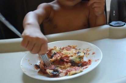 Here is Eden when I served her…and Elliot deep into tearing his pizza apart.