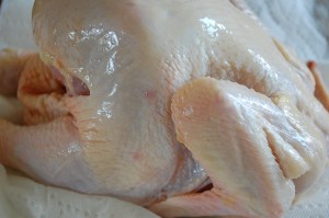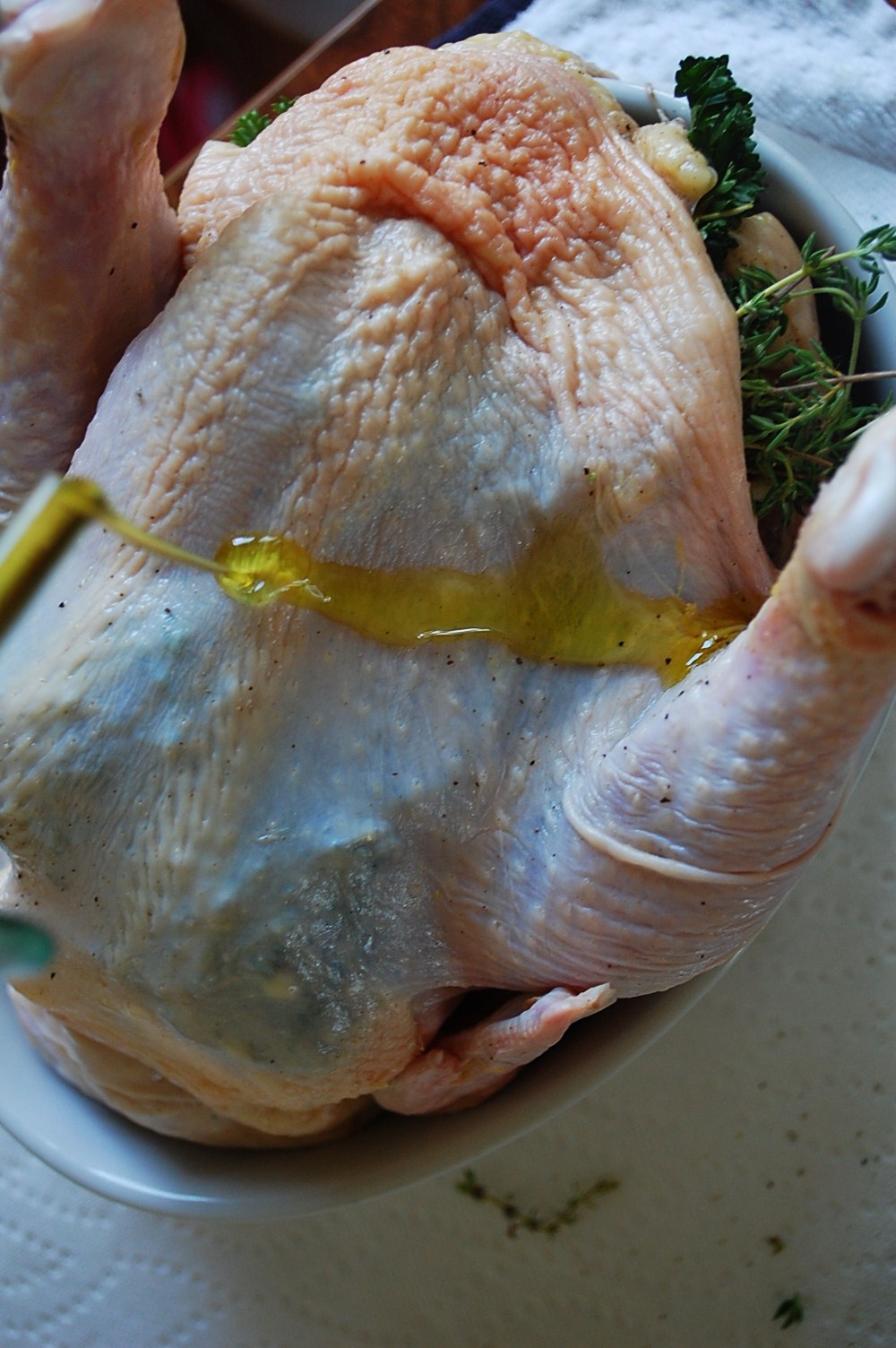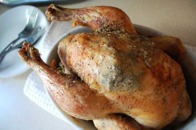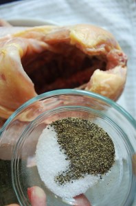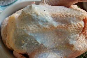 And then about a year ago we stopped buying super market chicken. We opted to buy 15 whole chickens from a seriously organic, nearby farmer; we were convinced of the integrity of his fine poultry. The flavor was outstanding and the texture was perfect! We had also bought 1/4 of a cow at the same time and since we had lots of the cheaper beef and so much less chicken we have eaten sparingly from our chicken stock. We have thoroughly savored each one but it was a bit of challenge to take on the entire bird and to cook it consistently well. I quickly learned that it is easy to roast and easy to vary the seasonings. My ‘teacher’ was Alice Waters, author of “The Art of Simple Food”. Her methods are beautifully simple and she goes into details about the reasons for different techniques. However, I will share my mental recipe as it it’s much shorter but still a very effective method.