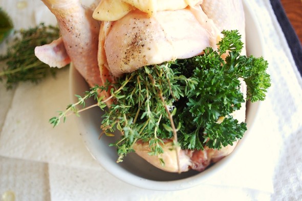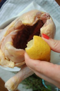 2. Squeeze the lemon inside the cavity and sprinkle with around a tsp. of salt. Stuff most of the herbs and garlic cloves inside the cavity as well.