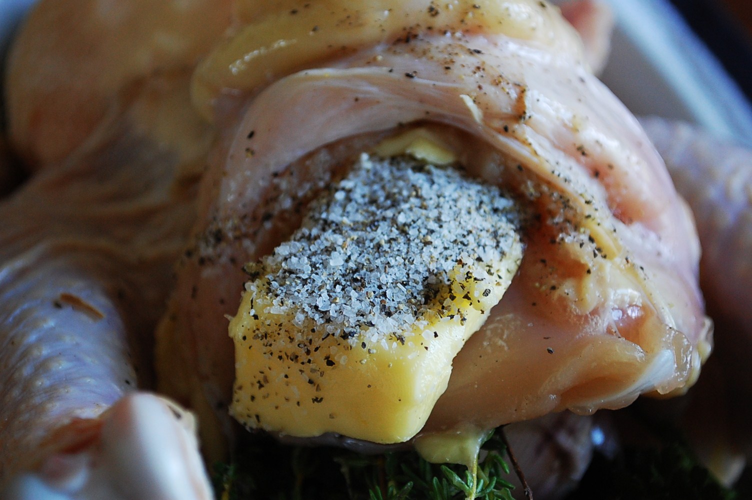 3. Slide your fingers under the breast skin, loosening and separating. Push a few tablespoons of butter underneath along with a few pinches of salt, pepper, and herbs.