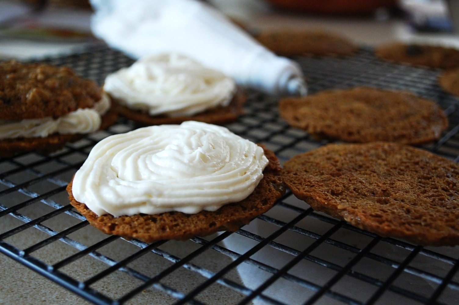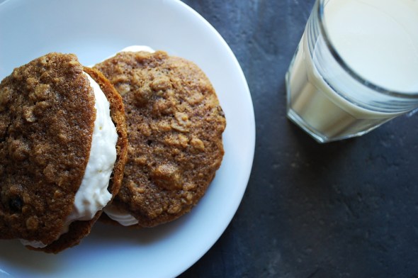 I made a tray of these for a potluck this spring and even though they oozed marshmallow creme filling, they were gone in literally 5 minutes! I felt pretty good that at least people weren’t ingesting chemicals or refined flour. That’s right, this recipe is purely whole grain but the cookies are still chewy, tender, and spicy. The filling is made with some of that amazing homemade fluff, the sweetness toned down a bit with cream cheese.  They have a bit of a wow factor because they look more professional than your average drop cookies, but really, that’s all they are. Drop cookies with some super-fun marshmallow filling slathered inside, very easy!