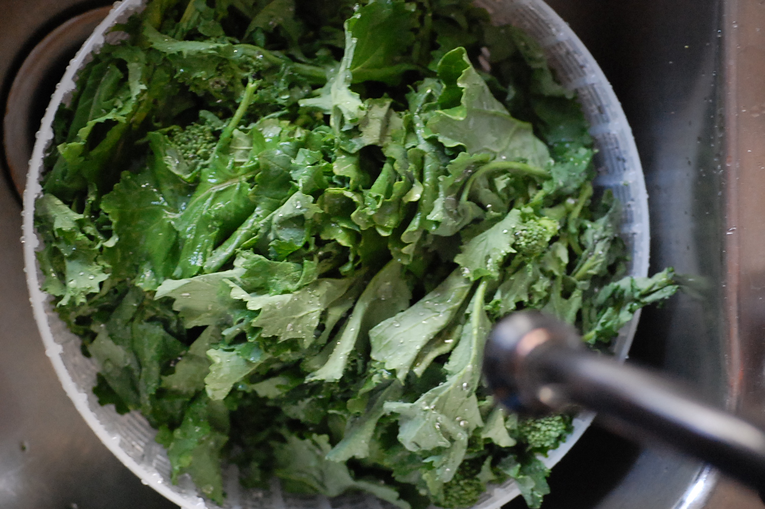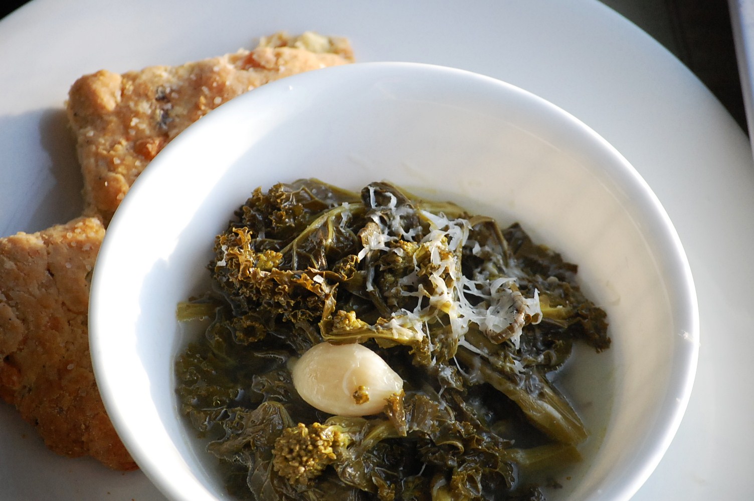 I had my epiphany with greens late last fall. After weeks of wrestling with recipes for the abundance of greens flooding our CSA, I found the ONE. Up until then I hadn’t found any recipe that just made me want to eat more than a few spoonfuls of our generously-growing kale, mustard and beet greens, collards, or broccoli rabe. Using salt pork or bacon for flavor is not always my thing, neither is consistently “boiling the greens to death” as so many recipes called for. This elegantly simple recipe was found in a Wegmans supermarket magazine and I am won over. If you are wanting to fortify your health for the winter/fall flu season, here is your recipe. You are loading up on vitamin-rich organic greens, plenty of lemon-tamed garlic to build immunities, and lashings of golden-green extra vigin olive oil to help you absorb the nutrients. I found myself devouring bowl after bowl one chilly afternoon when nothing else appealed to me. For some reason, I found this to be my elixer of satisfaction, quenching both my hunger and thirst.