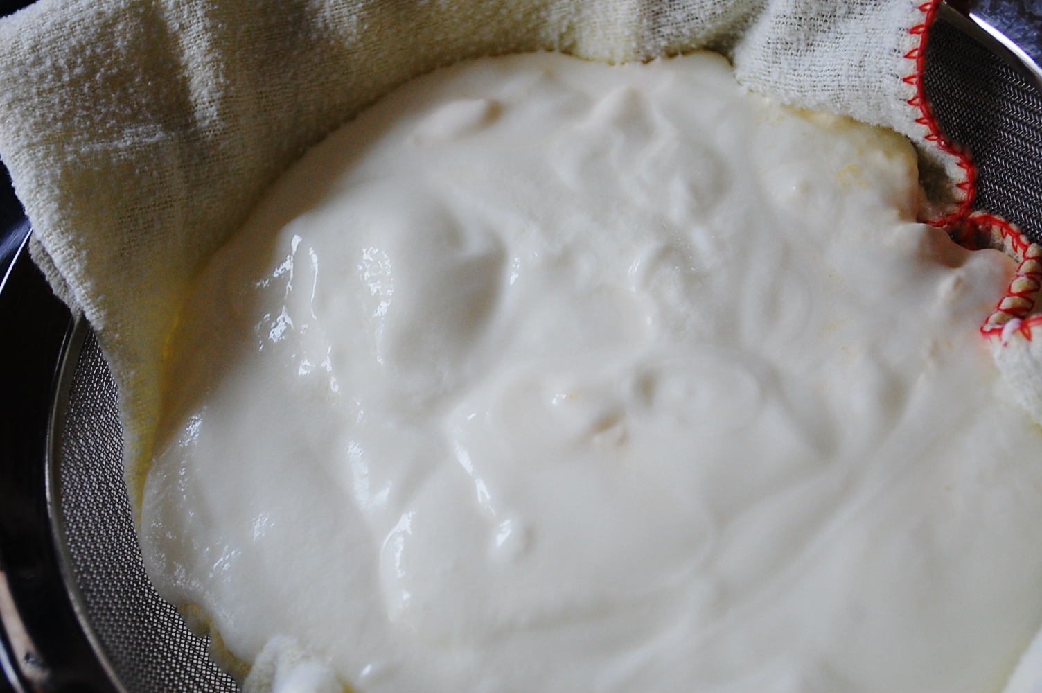 1. Pour yogurt into cloth-or-paper towel-lined strainer set over a large bowl. Cover and allow to strain for at least 6 hours. (I like just leaving it overnight.)DSC_0726
