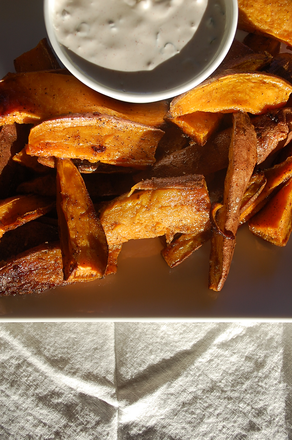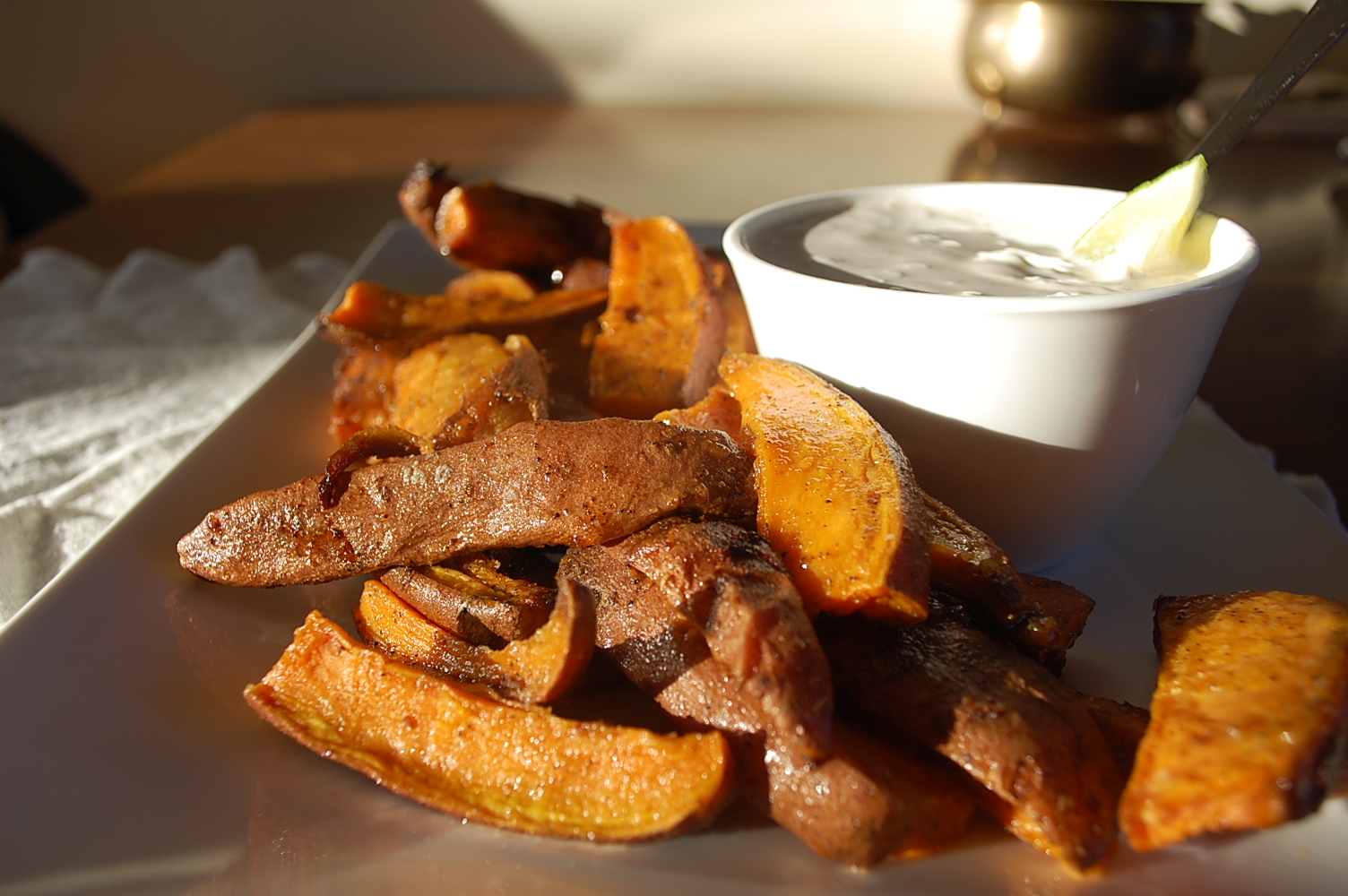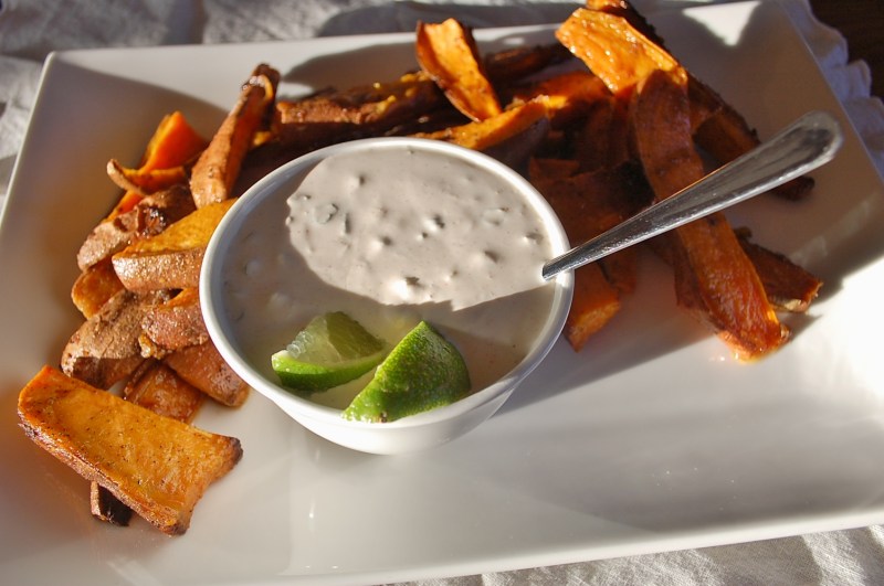 Sweet potatoes are an undeniably seductive vegetable with the fascinating ability to become crunchy or silky smooth with alternate preparations. Wearing both sweet and savory masks, they can switch between the dessert course or an entrée with delicious ease. My husband might be the only one who disagrees. he can’t help but feel vaguely uncomfortable at the taste of a vegetable possessing such honeyed qualities. These fries though, are an exception for him, bright rust-colored spears with a spackling of Latin spices and hints of spiciness on the fries and in the incomparably wonderful dip. Smoky chipotle, that overly trendy spice, has found a perfect relationship with the sweet, earthy stability of the sweet potato. Brightened by the excitement of lime juice and slivers of scallion, I have used this exciting dip in many scrumptious ways such as black bean burgers, a topping for the weeknight taco, and mixed with diced avocado. Pull out a tray and add a flashy bowl or even a chunky cup filled with the creamy dip and you have an appetizer or side dish that has taken only minutes of hand-on preparation.