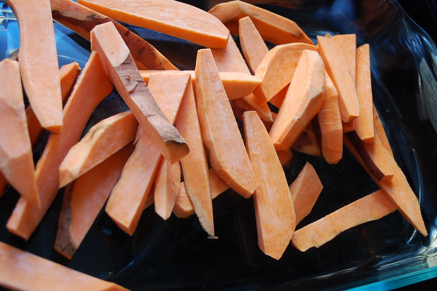 1. Peel sweet potatoes (if needed) and scrub well. Slice into wedges and tumble into a baking tray.