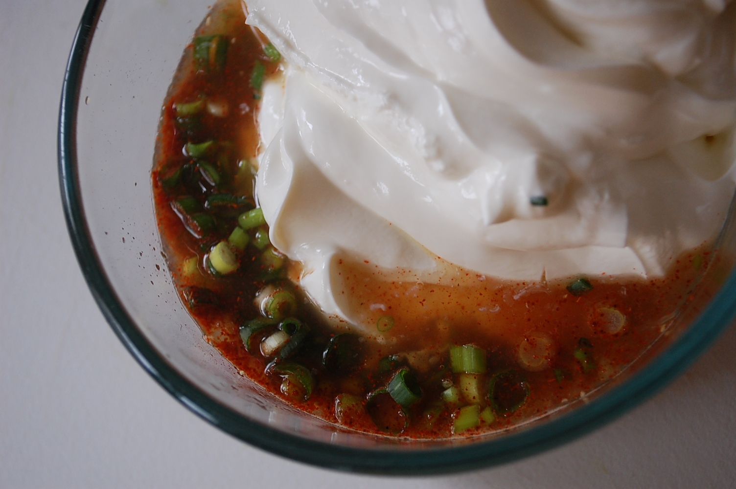 3. Put sour cream, chipotle powder, lime juice, and green onions into a bowl and whisk well. Chill until serving time.