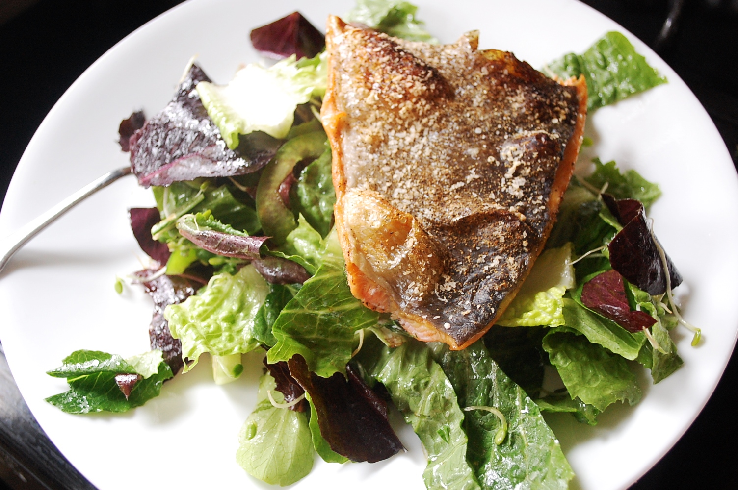 phenomenal superfood lunch of Dill-broiled Wild Salmon over Olive Oil Dressed Organic Greens. Spectacular and waistline friendly, thanks to THM insight.