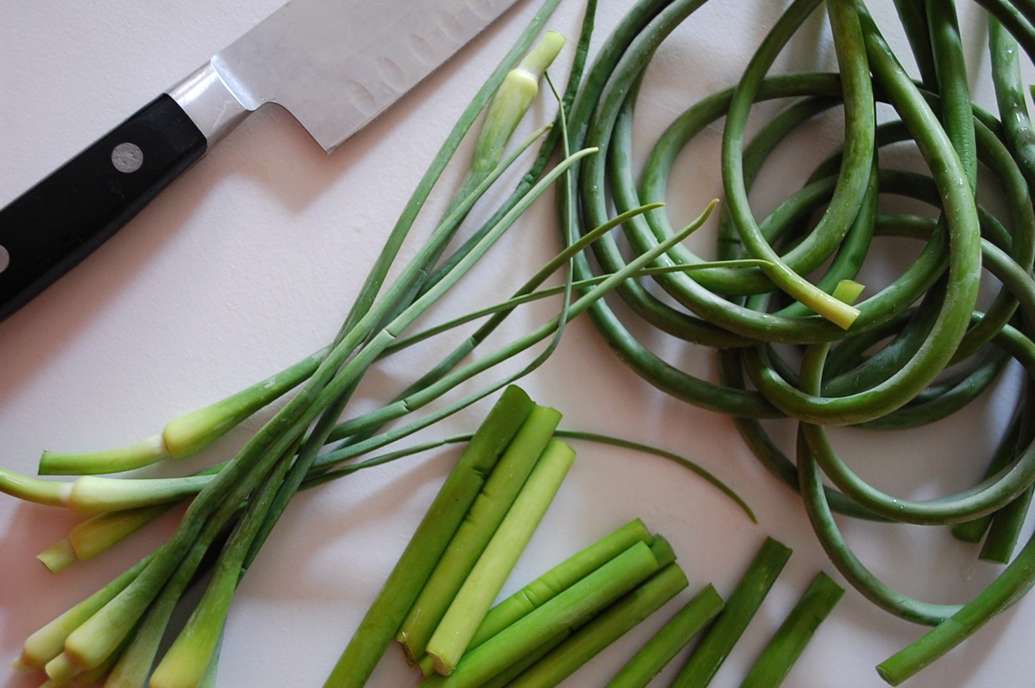 Garlic scapes are the young garlic shoots that appear just before the garlic bulbs are mature enough to harvest. They smell like the bulbs, though maybe more green, taste like garlic, but are more like asparagus or even green beans in texture. The first time I was presented with a bagful I was perplexed. Since that summer, 2 years ago, I have dabbled in the various and endless possibilities garlic scapes present. Chopped finely into any cooked dish you may want garlic in, they are a fresher, younger, more spring-like garlic flavor. Fresh, they offer a verdant garlic bite to preparations.