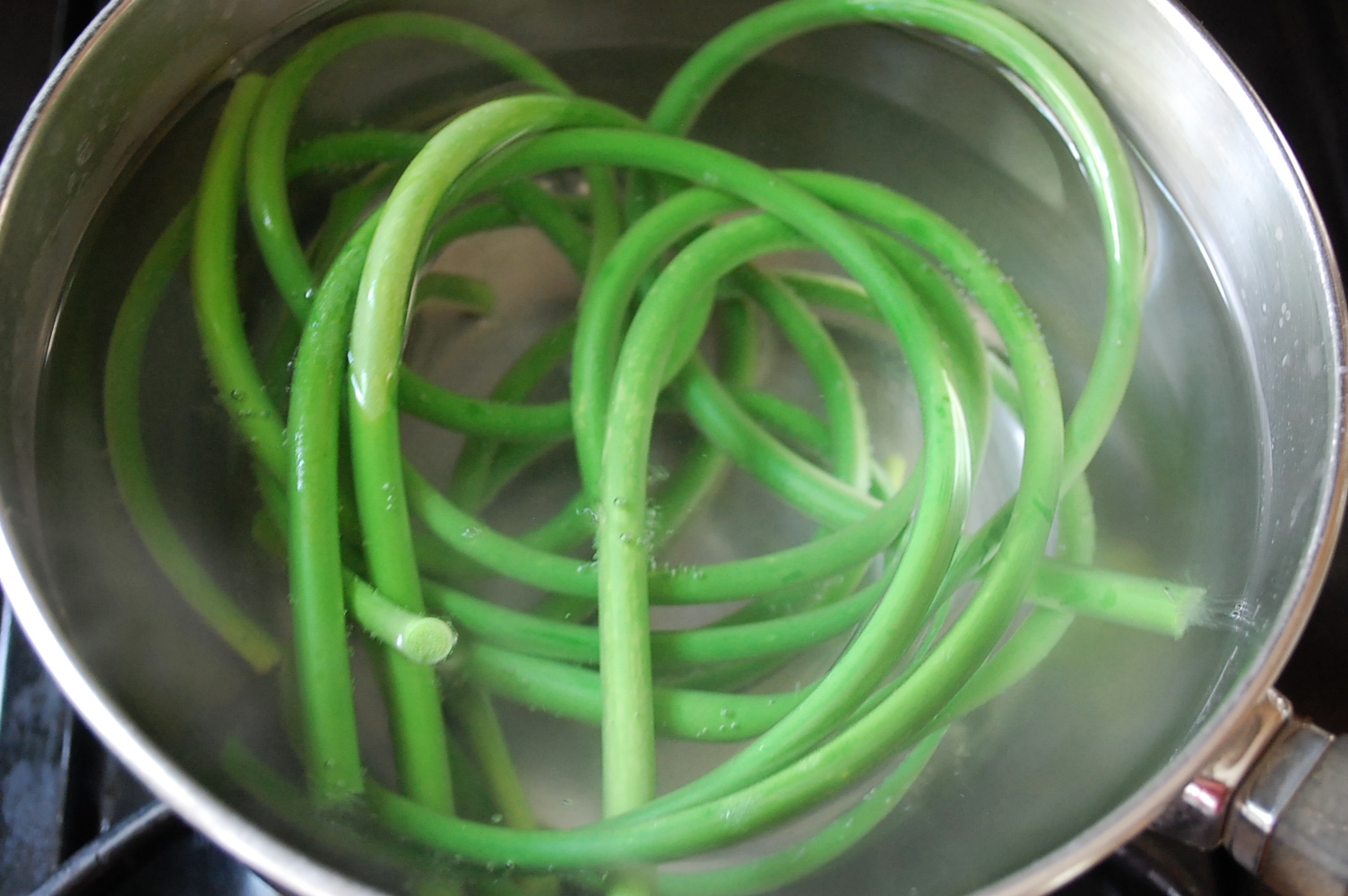 1. Trim woody ends and bulby tips from the scapes. Put on a medium-sized pot to boil, salt lightly, and prepare an ice bath or even a cold bowl of water. (to stop the scapes from cooking after blanching)