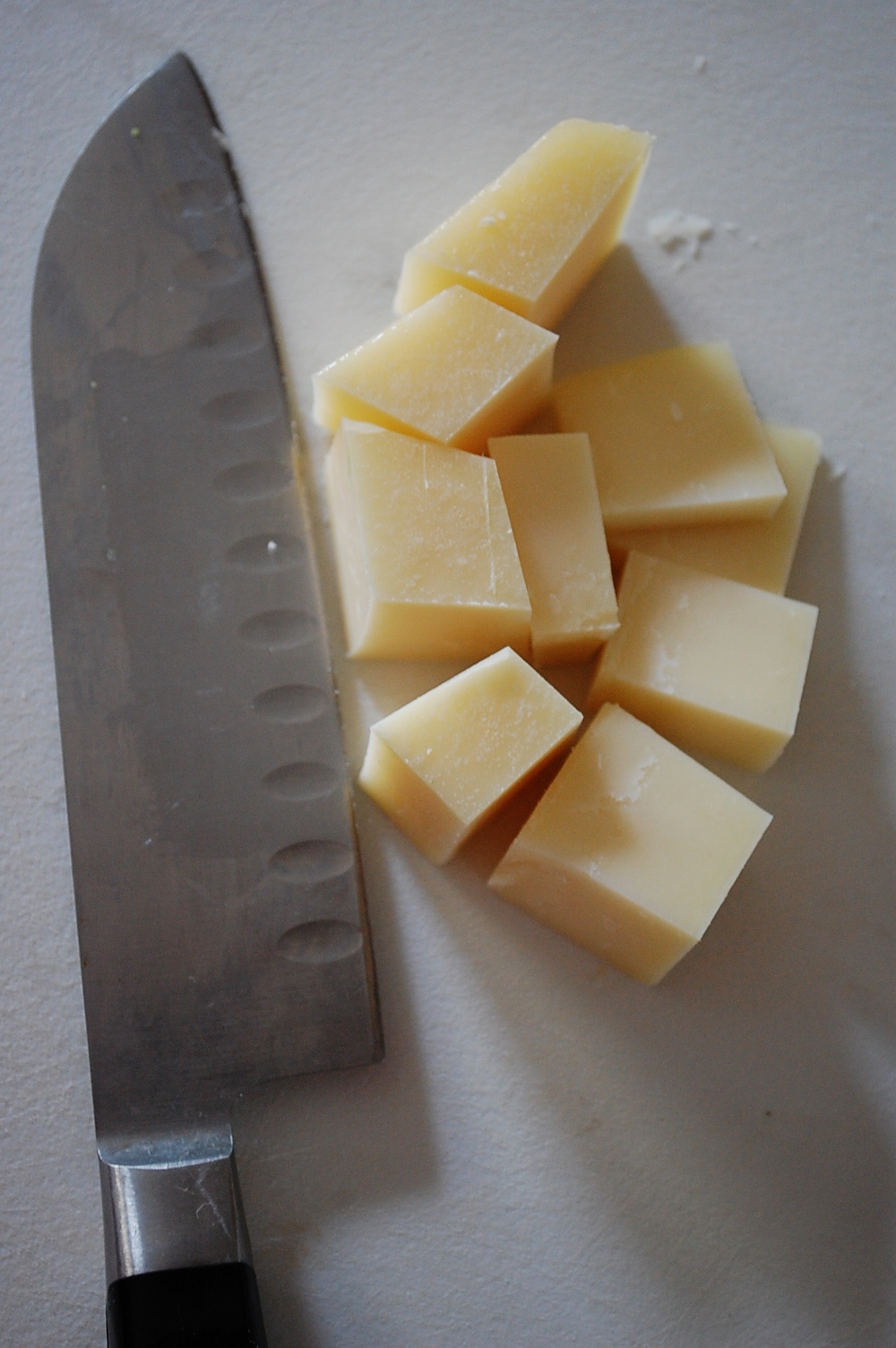 5. Chop Parmesan coarsely, add to the food processor along with the scapes, Process until pieces are relatively even and fine.