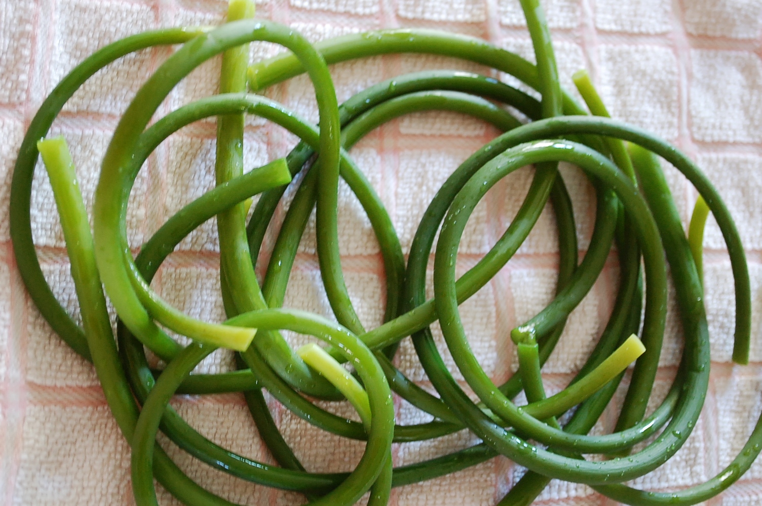 4. When the water is boiling, drop scapes in the water for 2-3 minutes, remove to a towel to dry.