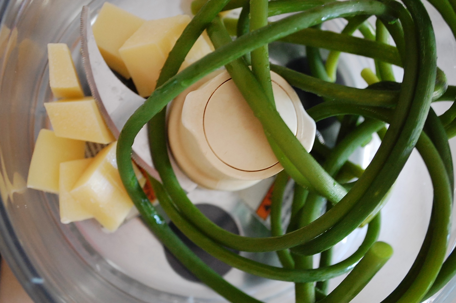 Pesto is a classic use of garlic scapes but here I tried to balance the straight-up garlic blast with pesto-y herbs and by blanching the scapes briefly to mellow them even further. Be sure to season the finished pesto properly with sprinkles of salt, as poorly salted pesto feels overly rich on the palate. Feel free to add more olive oil to make the pesto as runny as you might wish…also, as pine nuts are at black market prices, you could also sub cashews or walnuts.