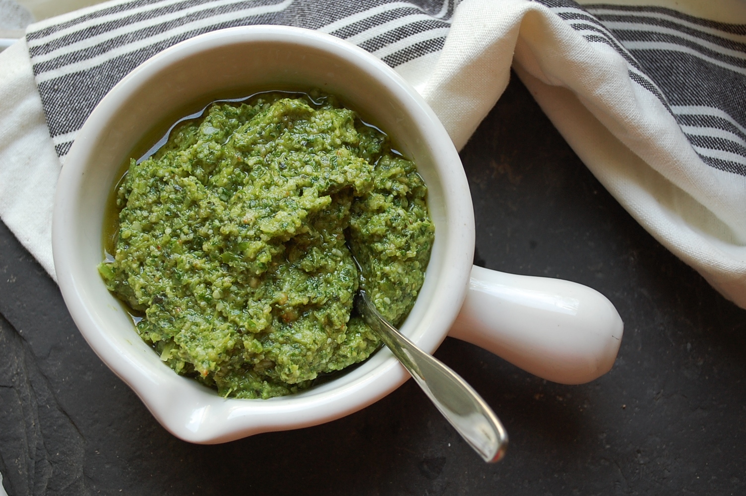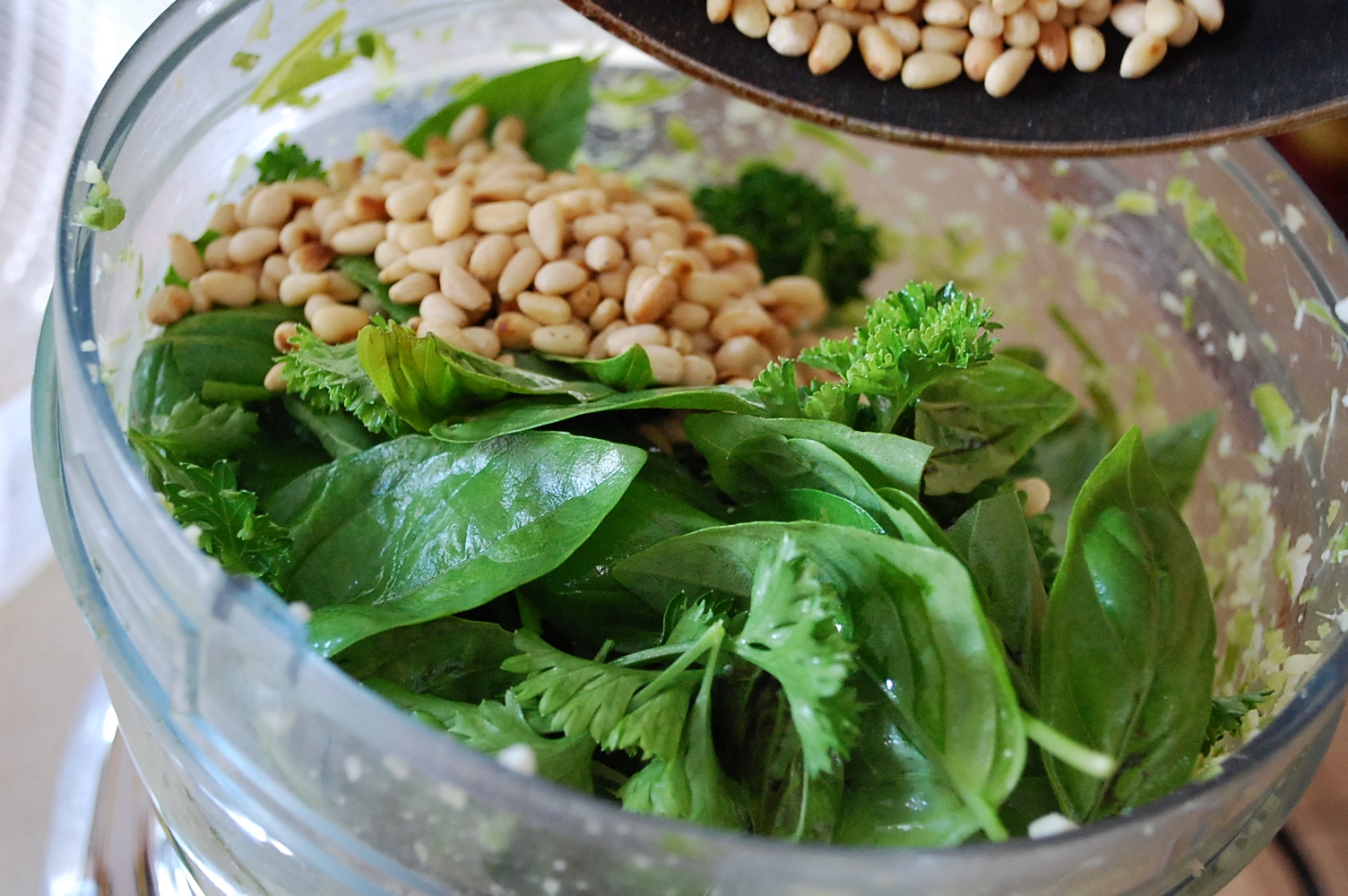 6. Add herbs, pine nuts, olive oil, salt, and pepper. Pulse briefly until even but still textured.