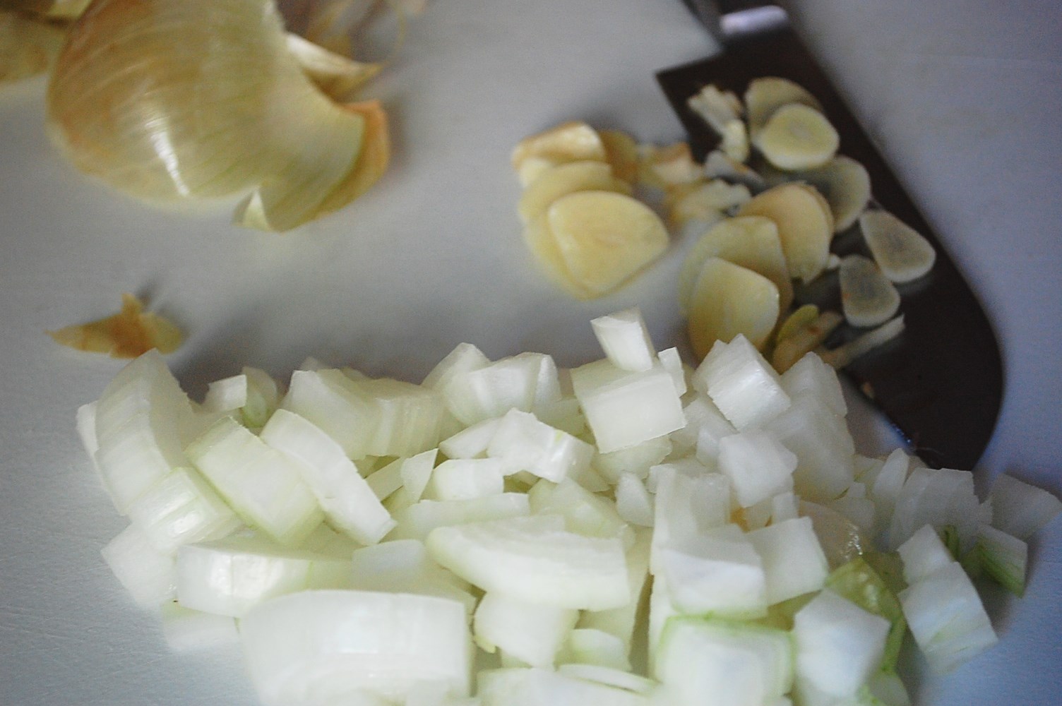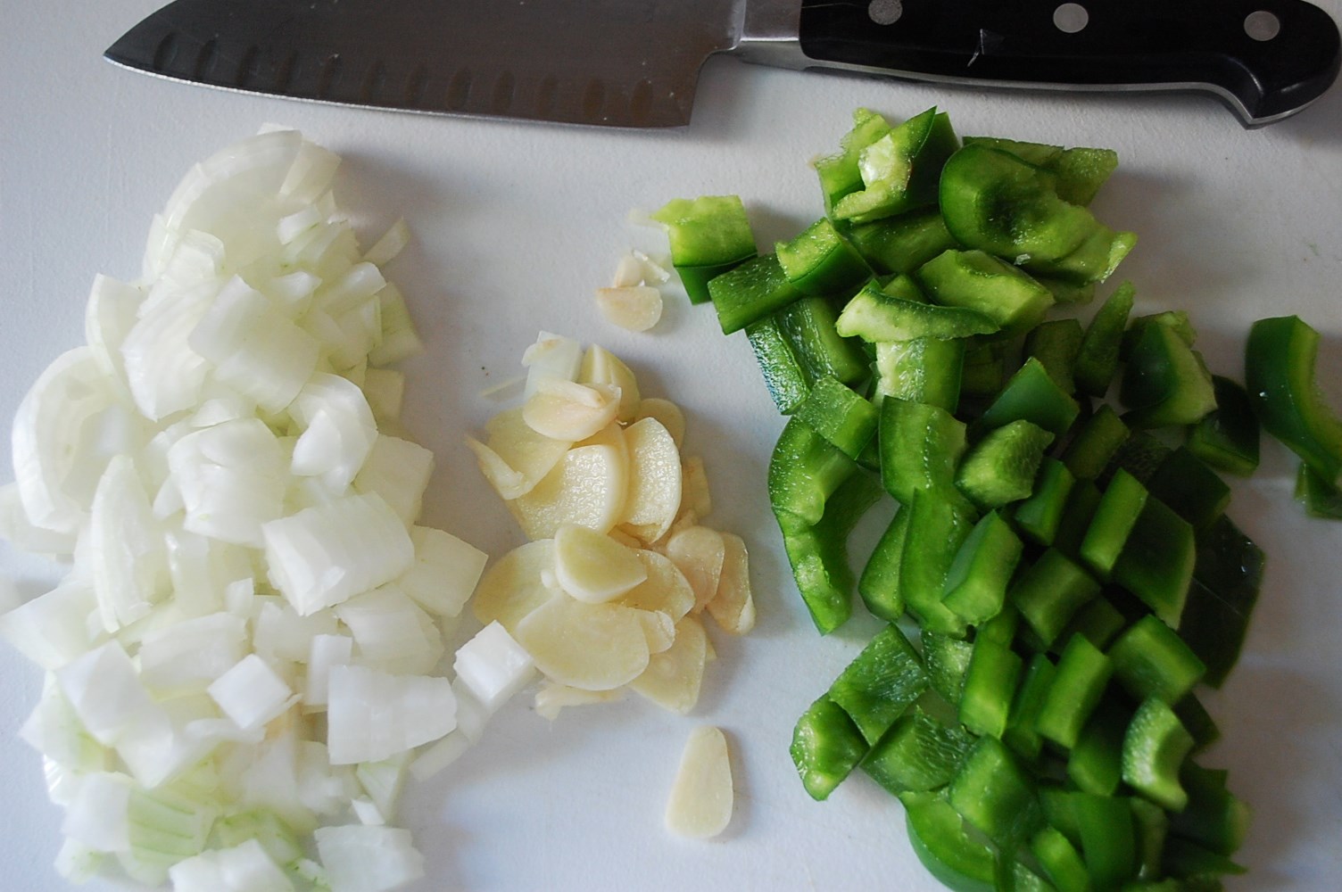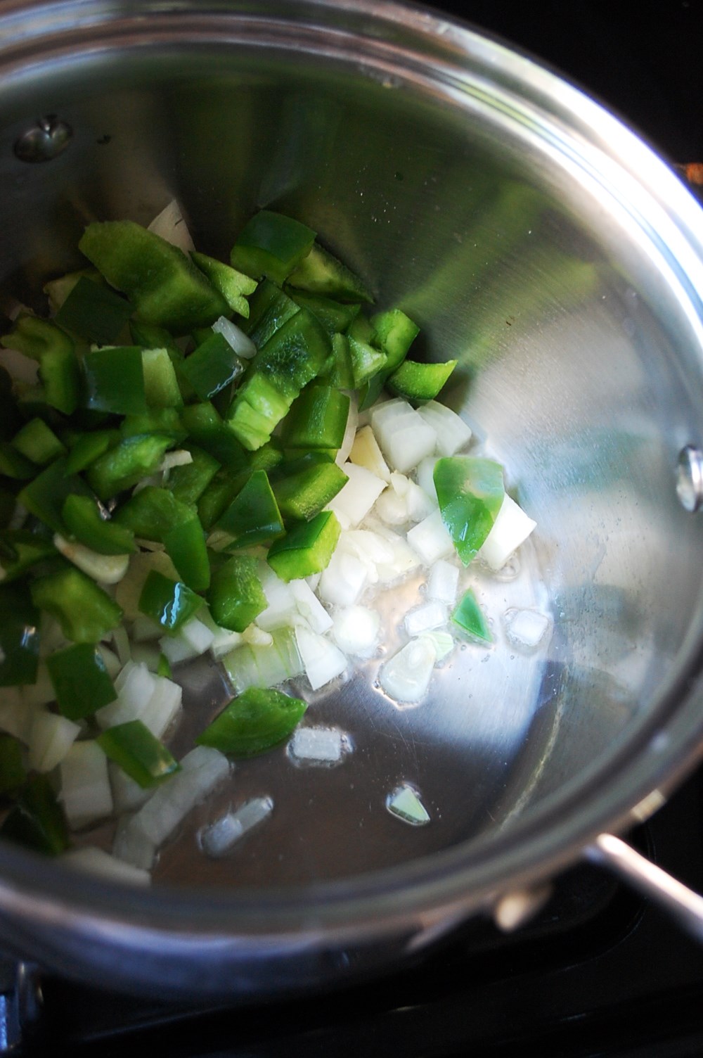 1. Dice onions and pepper. Thinly slice the garlic cloves. Pour oil into a medium-sized pot over med-high heat and add onion, pepper, and garlic. Saute 3-5 minutes or until slightly softened.