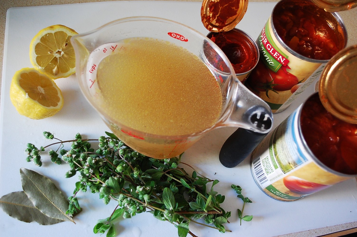 2. Slice mushrooms and add to pot along with bay leaves, broth, tomatoes, tomato paste, salt, pepper, marjoram or oregano, and optional honey. Cut the lemon in half and squeeze one-half into the pot.